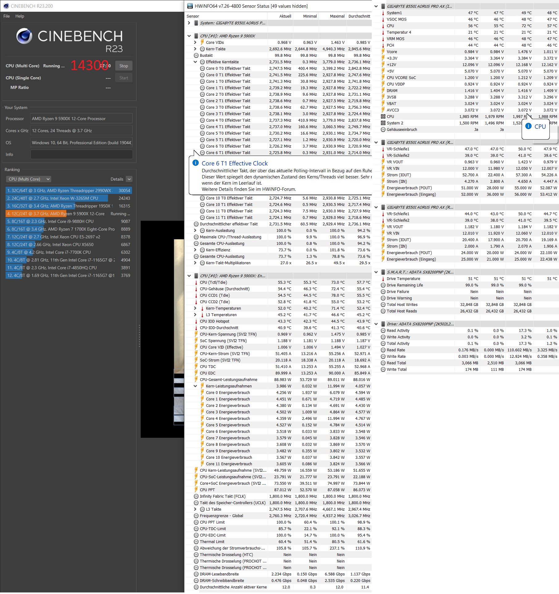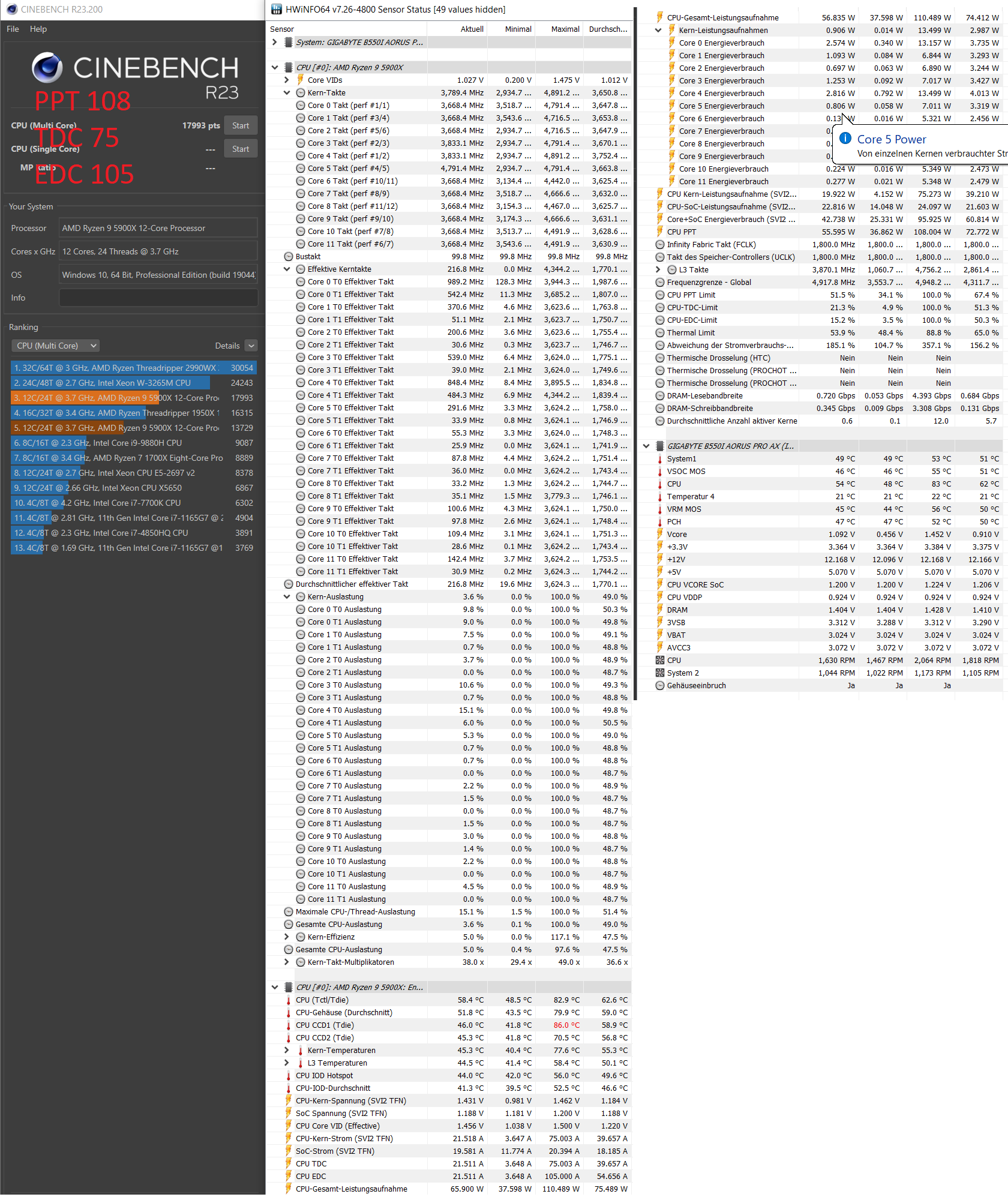 @Nixdorf So sieht es bei mir als Vergleich aus, wärend Cinebench läuft. Bei mir die W/Kern auch um einiges höher als bei Bullz.
