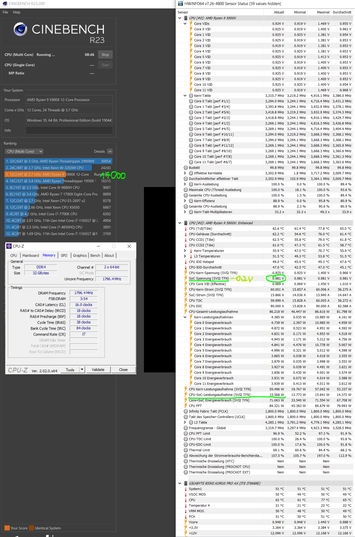 Eine erste Meldung hatte nur den CO, da waren es 14800 Punkte. Viel mehr ist da auch ohne mehr Power-Budget nicht zu erwarten gewesen. Den Schritt auf 17000 brachte dann das Absenken der SOC-Spannung. Da sind dann 8-10W für die Kerne frei geworden, welche von denen dankenswert für mehr Takt genutzt werden.