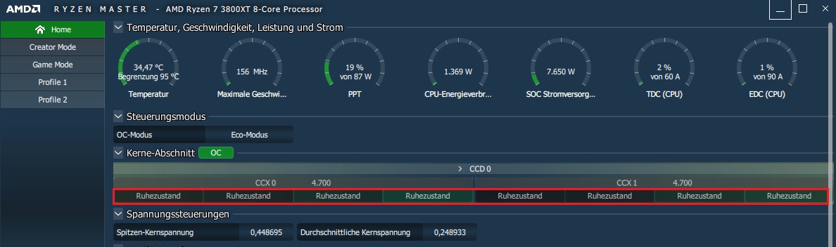 Und ich sehe das auch bei mir mit Ryzen Master.MOST tools can only show you the last clock and voltage of the core before the core went to cc6. So if you were at full 4.5GHz+ boost @ 1.48V, then the core went to sleep, many tools might show the core(s) stuck at that value. The tool just doesn't know any better.