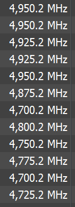 Die meisten Kerne takten nur auf knapp 4,7 GHz. (4,675 GHz). 2 der Kerne gehen auf 4,9 GHz. Dass die anderen nicht mal die 4,8 GHz erreichen verstehe ich ehrlich gesagt nicht.