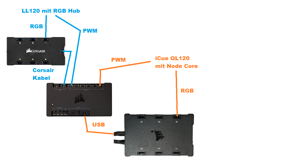 Mein Plan war es die 6 Corsair QL120mm Lüfter im Gehäuse zu verteilen und die beiden Corsair QL140mm Lüfter mit denen der Corsair H115i Icue Elite Capellix auszutauschen, die haben ja ML Lüfter von Corsair. Zudem habe ich 2x den Lightning Node CORE und 1x den Commander Pro von Corsair.