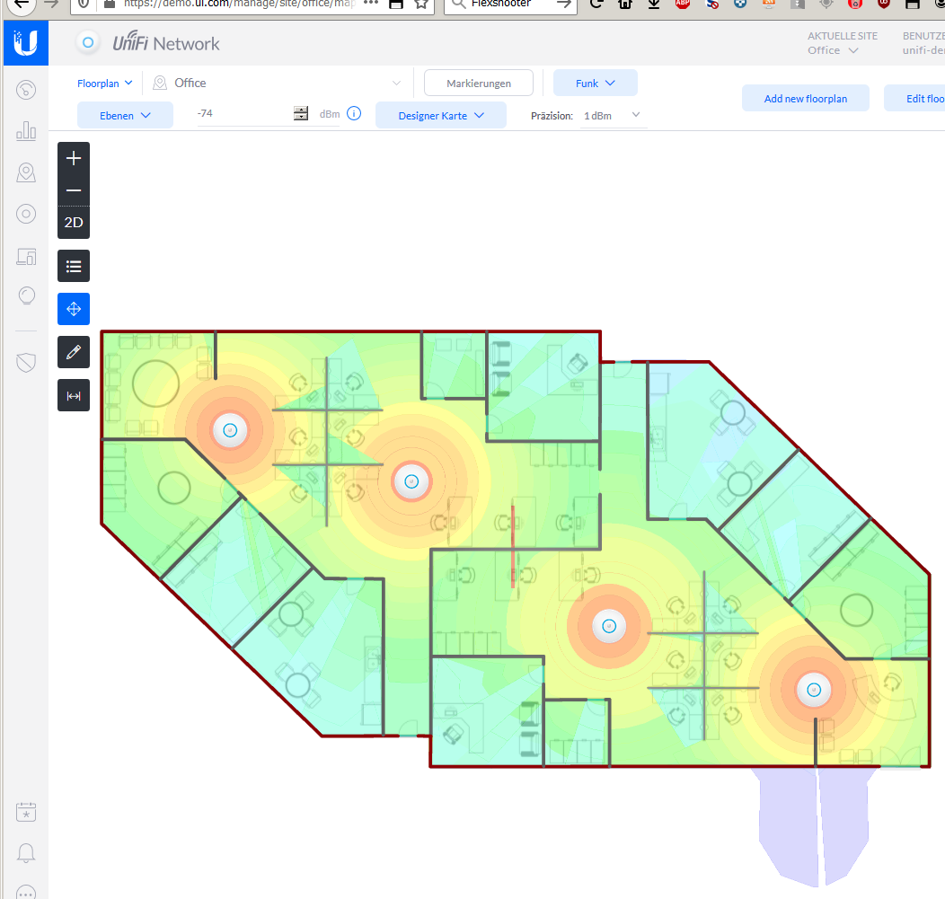 Der Wohnungsscreenshot hat rein gar nichts mit einer auch nur annähernd zutreffenden Funkfeldberechnung zu tun. Sieht man recht schnell am Flur. Da dort keine Hindernisse zwischen AP und Eingangsbereich sind, müsste die Signalstärke im Eingangsbereich sehr viel höher sein.