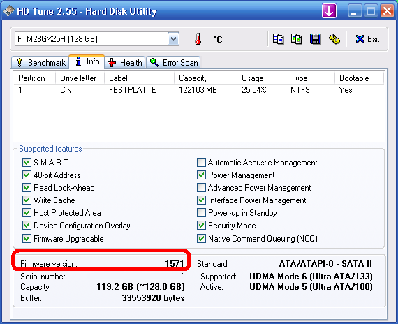 Nimm HDTune 2.55 auf dem Info Reiter steht die FW Version. Siehe Bild.
