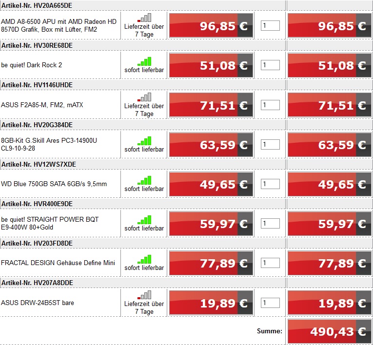 Mir fehlt noch ein passendes Gehäuse, nen seeeehr leiser Gehäuselüfter und nen CPU Kühler den man auch passiv betreiben kann.