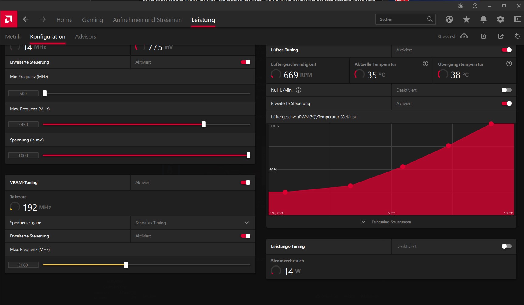 Den GPU-Kern habe ich auf 2520MHz im Treiber eingestellt, was unter Volllast in 2400MHz+ resultiert. Damit liegt der Boost niedriger als original, aber tatsächlich ist der Takt durch das damit mögliche Undervolting durchschnittlich höher und vorallem konstanter. Gerade in Situationen wo ohne diese Optimierung die Temperatur oder das Powerlimit begrenzen würden, kann der Chip nun frei laufen. Und der Verbrauch passt verhältnismäßig auch noch etwas besser zur gebotenen Leistung.