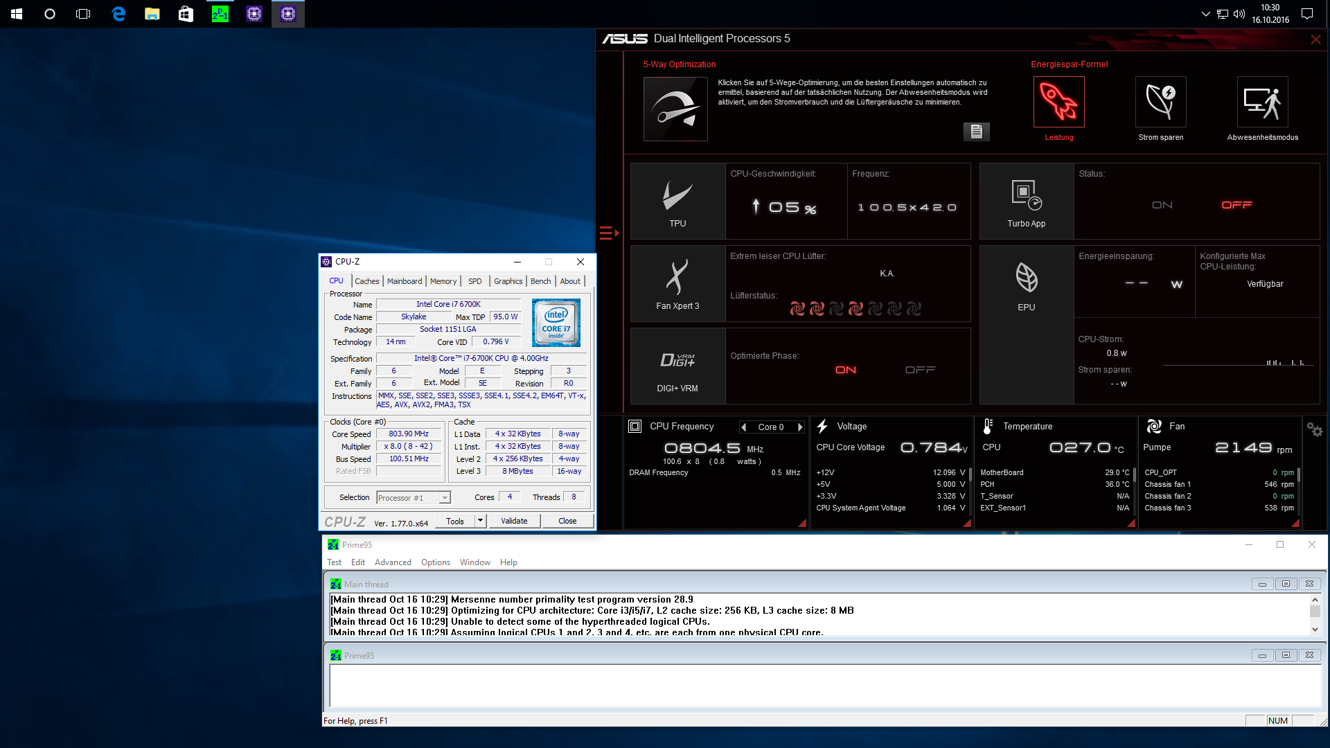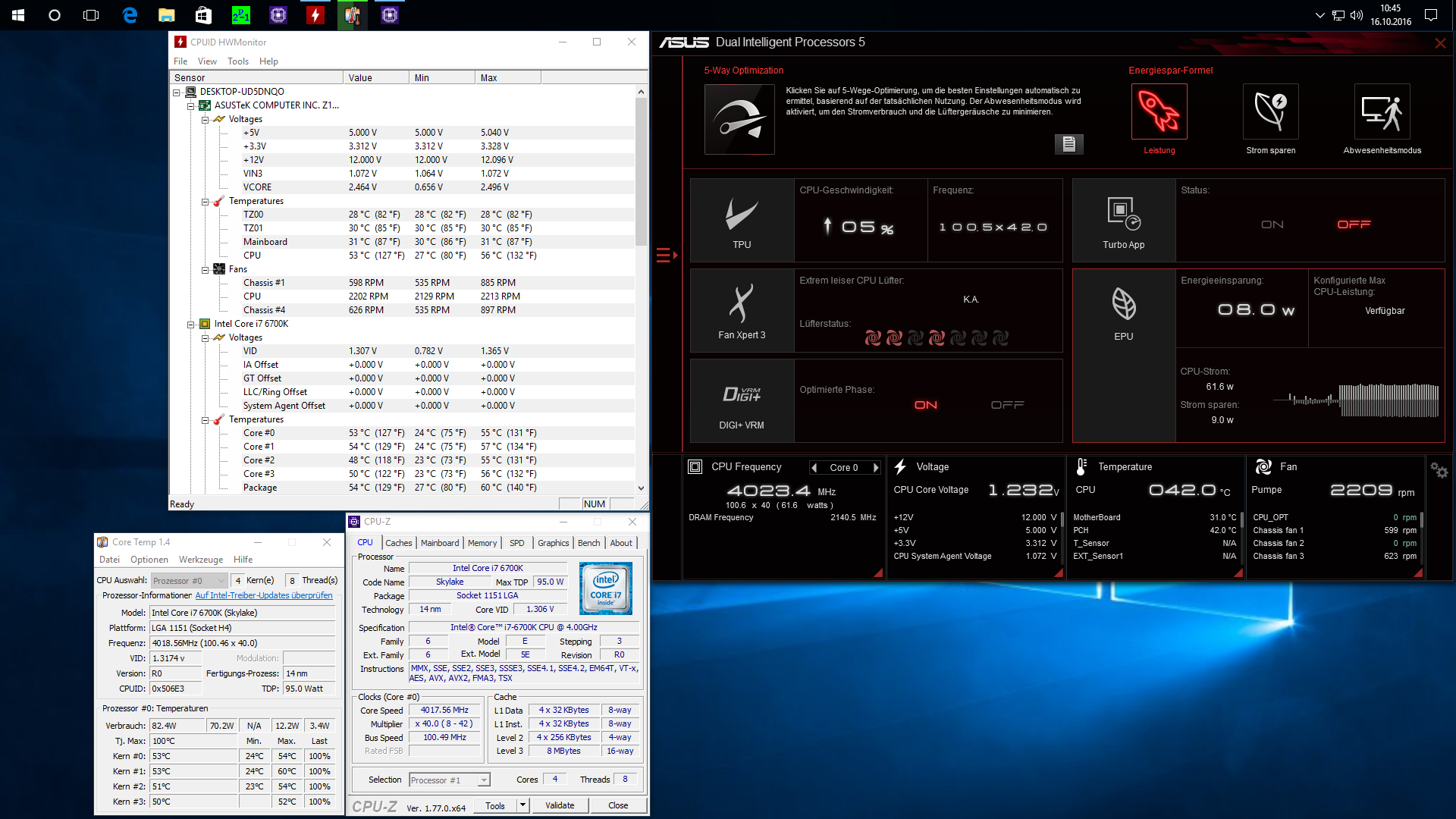 So weit so gut, was jedoch komisch ist. Die Asus AI Suite 3 zeigt mir diesen festen Vcore auch so (dauerhaft) an. Core Temp und CPU-Z zeigen mir zwischen 0,78 V (Idle) und 1,37 V (Last), obwohl die Spannung ja stets gleich bleiben sollte.