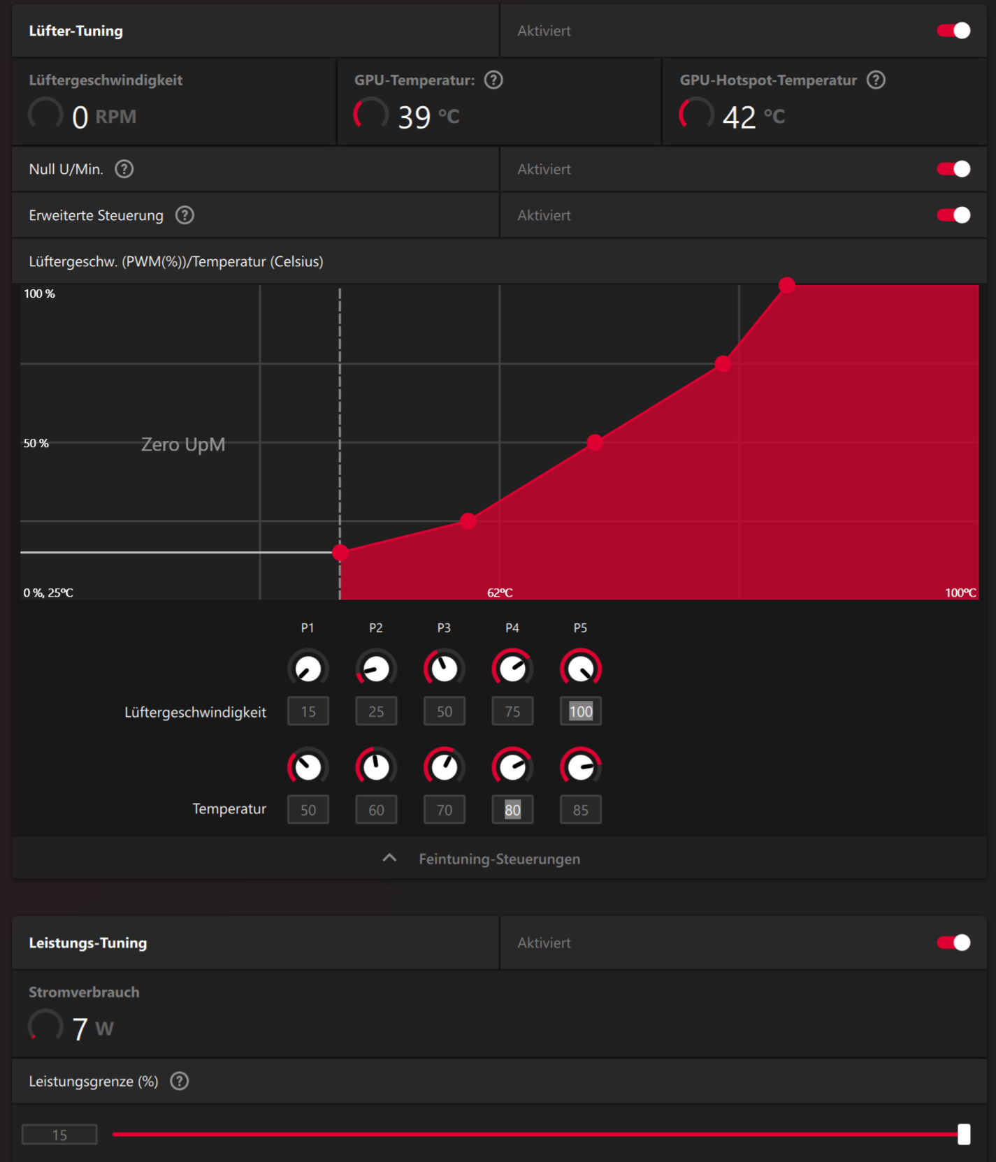 Ich habe die Karte ne Weile nicht genutzt. Es fiel sofort die Lautstärke auf. Die Temperatur ist voll im Rahmen bei max 58 Grad, aber der Hotspot ist ungewöhnlich heiß bei 84 Grad. Das ist ein 26 Grad Delta.