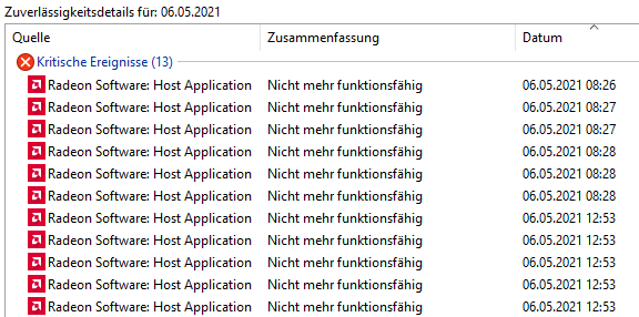 Unter noch nicht näher bekannten Umständen wird in der Ereignisanzeige bzw. dem Zuverlässigkeitsverlauf ein Appcrash der Radeonsoftware.exe protokolliert. Die Event-ID ist 1000. Screenshots: