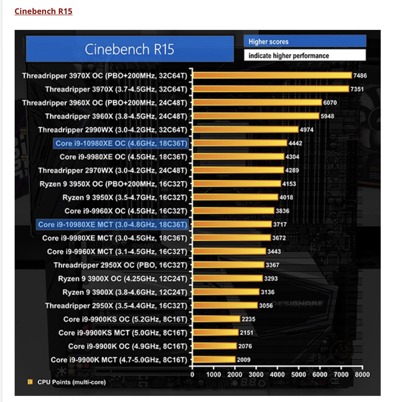 Wenn man allerdings schon rein die Leistung vergleichen willst und den Unterschied von Mainstream und HEDT ignorieren willst, @stock liegt der 9980XE (übrigens identisch zum 7980XE, 10980XE) leicht unterhalb des 3950X in Cinebench R15, sobald man allerdings den offenen Multiplikator der Prozessoren ausnutzt wendet sich das Blatt, wobei 4,6Ghz noch “human“ für den 9980XE/10980XE sind.