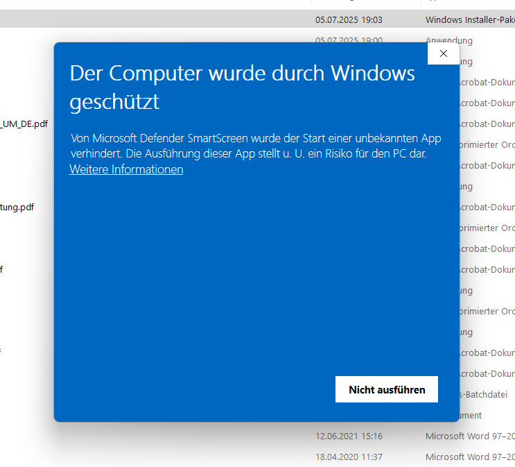 Kurz nach klick auf den Installer, bekomme ich die Meldung vom MS Defender, siehe Screenshot,