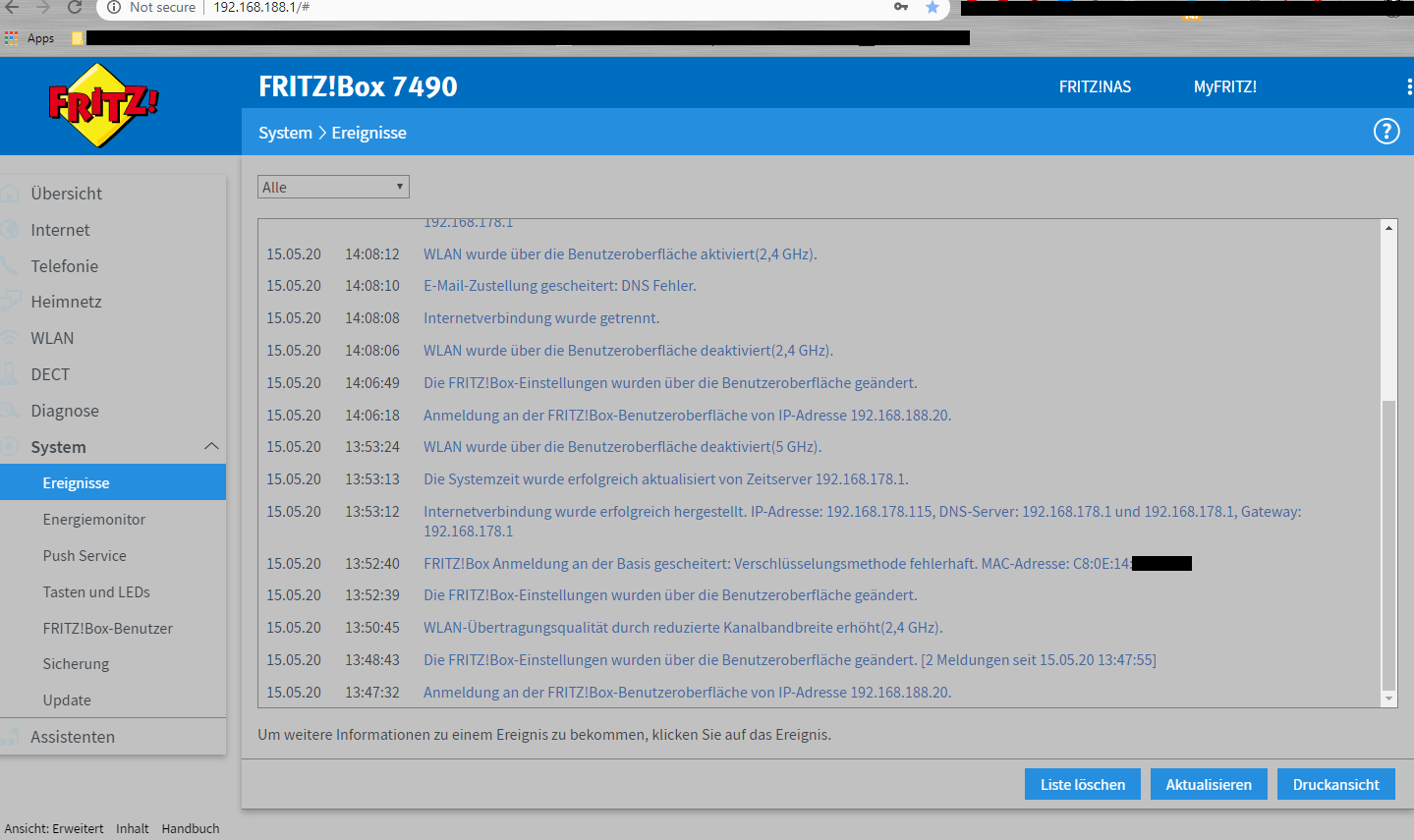 Verbindet sich ein Gerät per WLAN mit dem Repeater bricht der gesamte Repater ab. Die Datenrate zur Basisstation im WLAN Fenster sinkt von 267/176 auf 1/1 und unter System Eregnisse kommt die Meldung " Fritz!Box Anmeldung an der Basis gescheitert: Verschlüsselungsmehode fehlerhaft". Unter den Zugangsdaten wird die Basisstation NIE wieder erkannt! Man muss bei Internetanbieter erst etwas anderes auswählen (das scheitert natürlich) und anschließend wieder "Vorhandener Zugang über WLAN" mit der Auswahl der Basissation damit die Repeatergeräte wieder Zugang haben. - Der Vorgang dauert jedes mal so 5-10 min, nur leider tritt das Problem auch sporatisch auf, also ohne das sich ein WLAN-Gerät mit dem Repeater verbindet. Ich schätz so alle 3-4 Stunden mal.