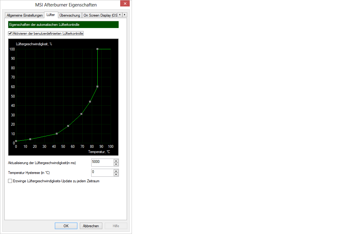 da ich gerne auch beim gamen einen leisen PC habe, habe ich eine manuelle Lüfterkurve für meine HD7950 von Gigabyte (WF3) erstellt. Beim zocken gerade (2 Stunden Tomb Raider9 ging die Karte auf max 75°C und lag im Schnitt bei 72°C.