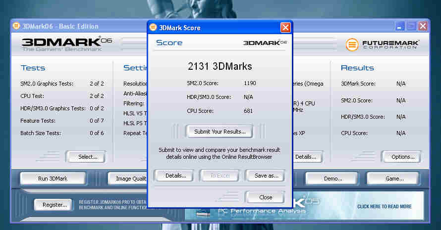 Die Leistung scheint mir für eine 7800 GTX aber etwas mager zu sein. Selbst im unübertakteten Zustand sollte sie wesentlich mehr bringen. Mein schon etwas in die Jahre gekommenes System ( P4C800 E-DLX, P4 3.2 Northwood, Sapphire X850 XT-PE@558/612, 2048 MB Arbeitsspeicher) sollte auf jeden Fall weniger Punkte machen als dein System. Komme ohne den SM 3.0 Test (wird von meiner Graka nicht ünterstützt) immerhin noch auf 2131 3D Marks. Wer weiß, vielleicht ist die Graka defekt. Wenn es sich nur auf die SM-Werte bezieht, kannst du doch aber zufrieden sein.