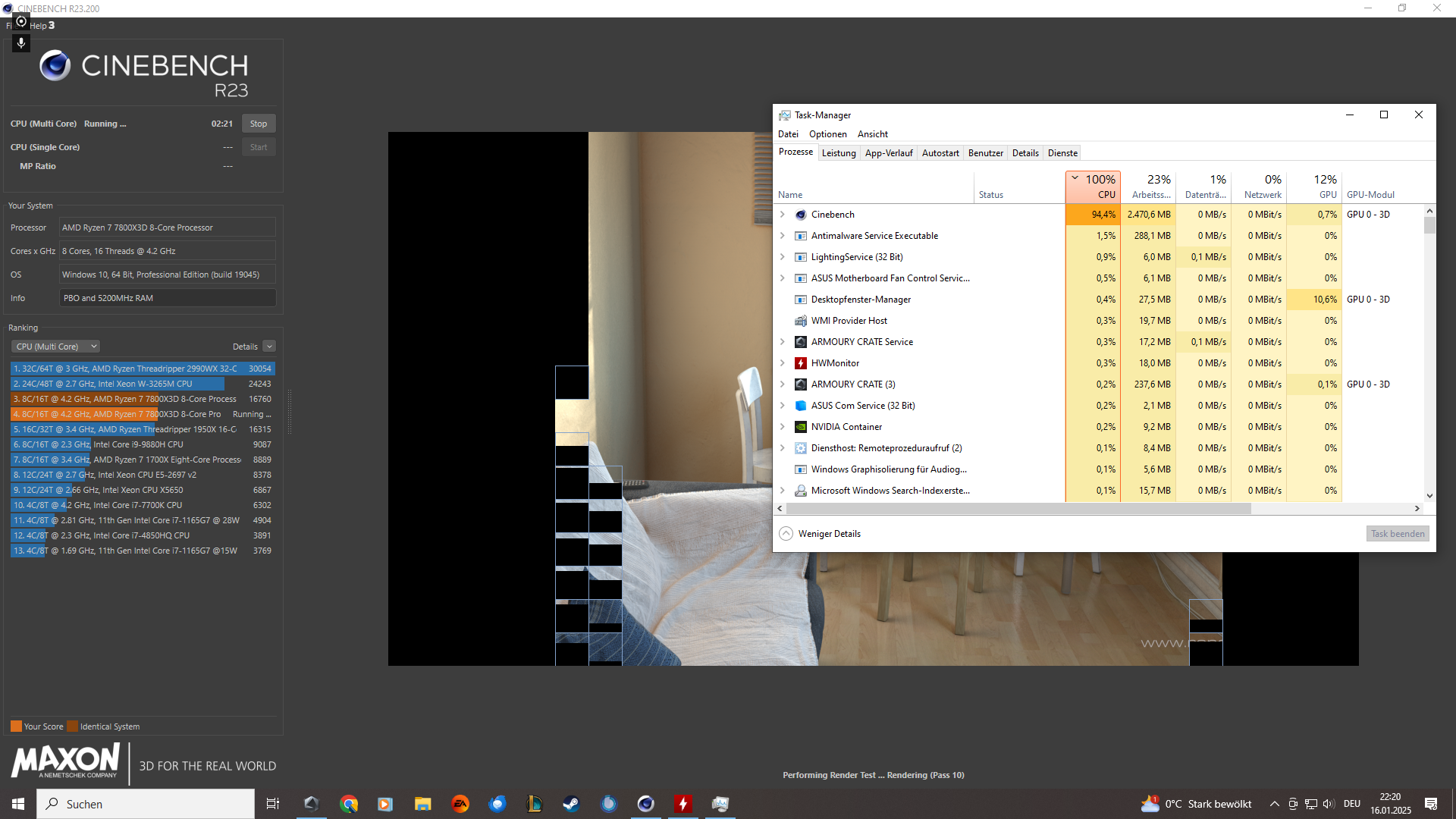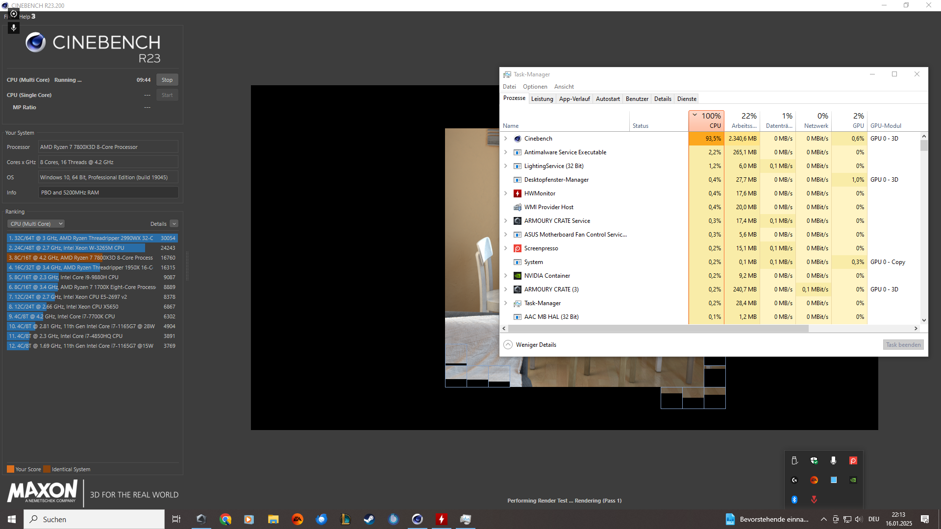Screenshots im Anhang vom CineBench R23 Wert, HWMonitor Werte, Taskmanager & ARMOURY CRATE während CB läuft und danach etc.