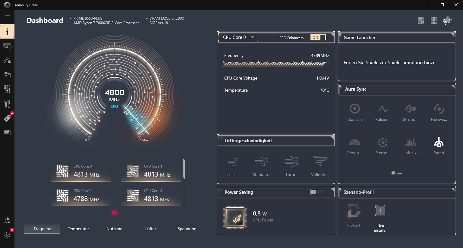 PBO aktiviert, automatische Lüftersteuerung statt eigene Kurve, RAM Takt von 4800 auf 5200 erhöht, Chipsatztreiber aktualisiert