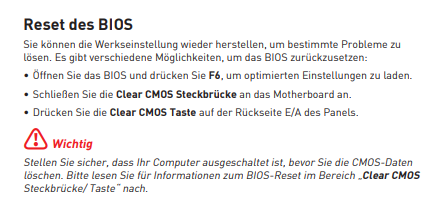 ... CPU von Strom genommen (Kabel am Mainboard) ebenso das dicke kabel am Mainboard (name fällt mir jetzt nicht ein) abgenommen, Mainboard Batterie raus genommen für 10 Minuten um das BIOS zu reseten.