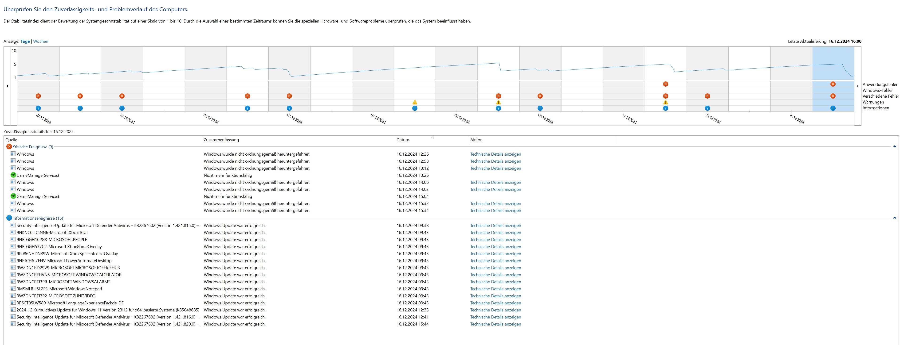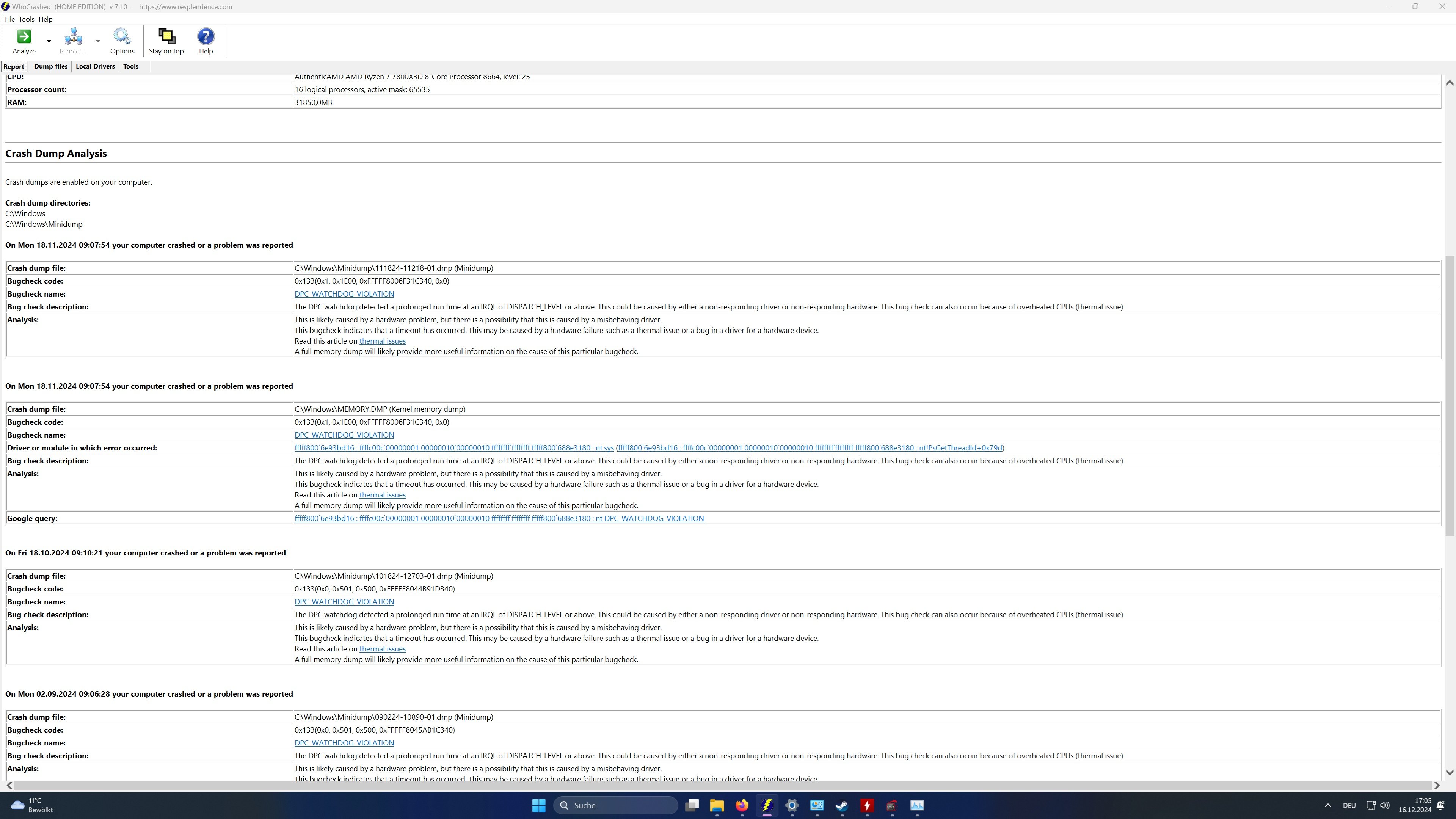 Windows generiert bei den Crashes keine Dumpfiles, generell habe ich keinen Fehlercode gefunden der Zeitlich zu den Abstürzen passt.