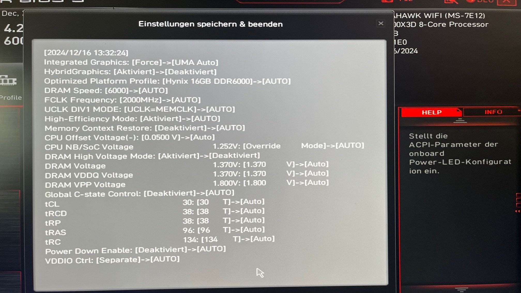 Im Bios selbst habe ich derzeit alles auf Default laufen (kein XMP), der Rechner lief aber auch nicht besser oder schlechter als ich die CPU etwas undervoltet und / oder den Speicher auf 6000mhz habe laufen lassen. Welche Einstellungen ich im Bios speziell schon versucht habe ist im Bild zu sehen.