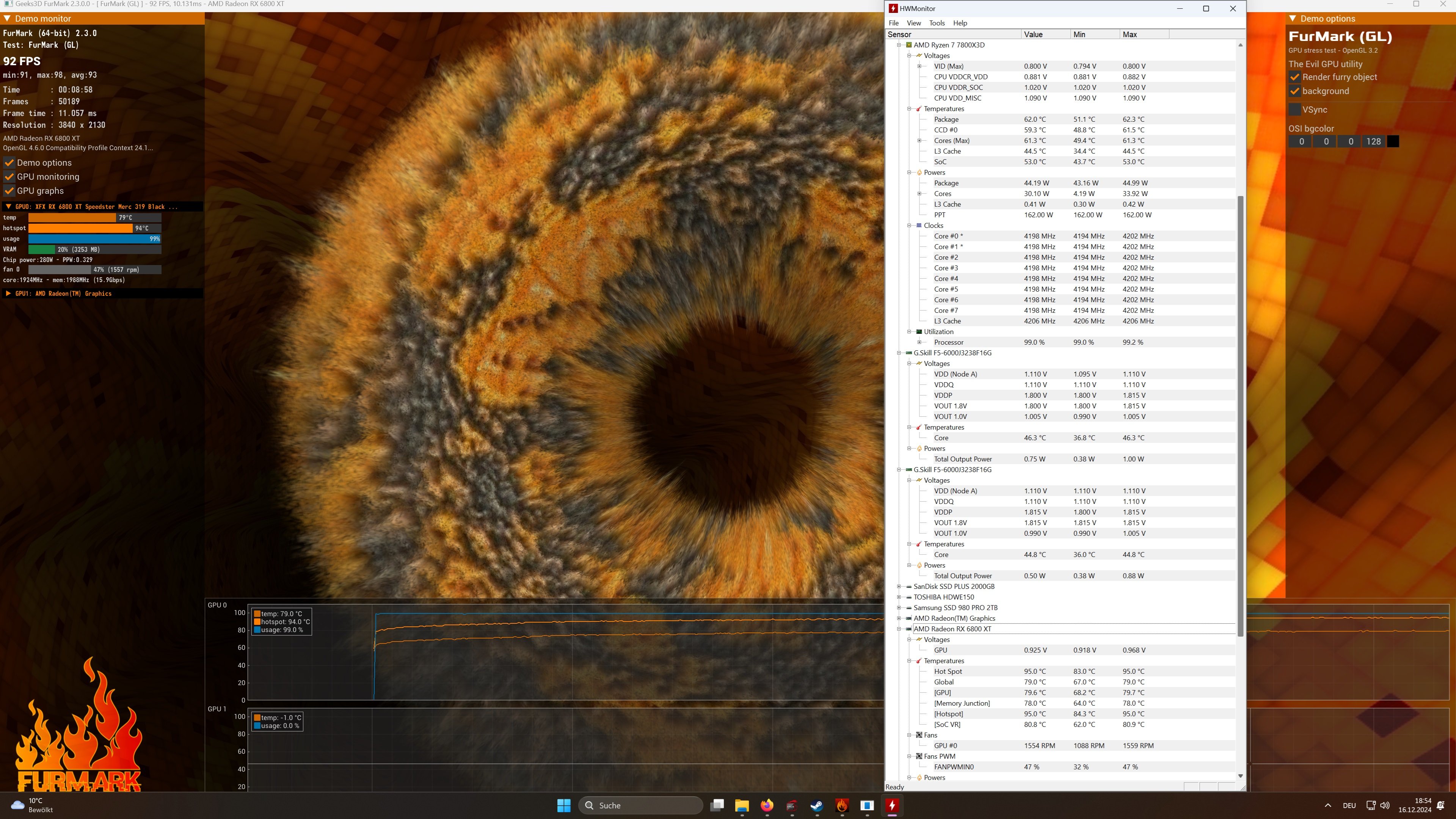 Furmark Cinebench einzeln und in Kombination hab ich gemacht, keine Fehler. Temperaturen siehe Bild nach ca 20 Minutn im geschlossenen Gehäuse. Wäre das denn ein typisches Fehlerbild bei einer defekten Graka und würde da nicht eher nur das Spiel abstürzen mit zB Treibertimeout? Ich habe das bei dieser Grafikkarte wenn ich Raytracing aktiviere, dann stürzt jedes Spiel direkt ab, allerdings nicht der komplette Rechner...der Unzensierte schrieb:Bei dem Fehlerbild kommt gar viel in Frage. Aber erste Regel bei instabilem System: alles OC raus, auch EXPO, alles auf Standard. Also ab ins BIOS, CMOS clear, fail safe defaults laden. Kann mir zwar nicht vorstellen das der 7800X3D die 6000 nicht packt, aber man weiß ja nie. Dann alles andere auf Standard. Dann beobachten, ein paar benches durchlaufen lassen und die Temperaturen beobachten (HWiNFO taugt da hervorragend, gibt´s hier auf CB im download-Bereich), Prime95 für die CPU, irgendein Grafikbenchmark für die GPU (3DMark, zur Not Furmark, sollte beides auch im download-Bereich zu finden sein). Läuft einzeln? Fein, dann Prime und Furmark beides gleichzeitig. Startet dann der Zirkus - Netzteil. Und ohne hier Panik verbreiten zu wollen - so wie bei dir sah es bei mir aus als meine XFX6800XT Merc319 Black Edition sich verabschiedet hat. Die hat allerdings schon beim 3DMark keinen Durchlauf mehr hinbekommen.