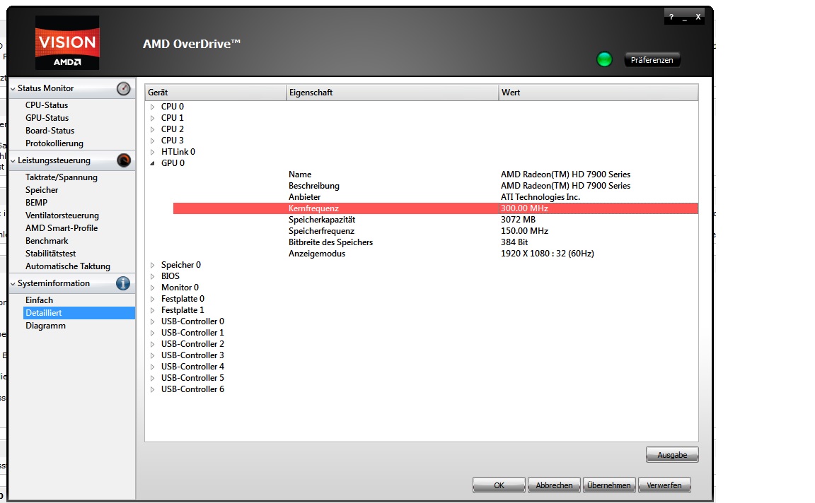 ich habe irgendwie bei meiner ATI 7950 HD Grafikkarte nur eine Kernfrequenz von 300 MHZ und eine Speicherfrequenz von 150 MHZ kann es sein, das es vom Board irgendwie noch geändert werden muss?