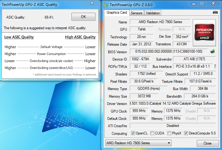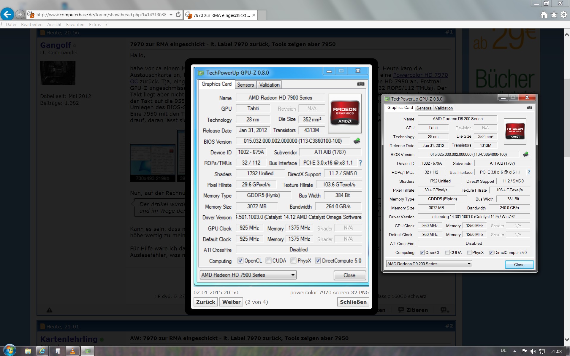 habe vor ca einem Monat eine Powercolor HD 7970 V3 zur RMA eingeschickt. Heute kam die Austauschkarte an, lt. RMA-Beleg und Label auf der Grafikkarte (!) bekam ich als Austausch eine Powercolor HD 7970 OC zurück. Tja, eingebaut, getestet, gefreut - läuft einwandfrei. Nur: Furmark zeigte mir eine HD 7950 an. Erstmal GPU-Z angeschmissen, dort wurden mir die technischen Daten einer HD 7950 ausgegeben (32 ROPS/112 TMUs). Der Takt liegt aber nicht bei den 800 MHz der normalen HD 7950 sondern bei 925 MHz und per BIOS-Schalter lässt sich der Takt auf die 955 MHz der 7970 OC Version anheben. Die technischen Daten in GPU-Z ändern sich durch das Umlegen des BIOS-Schalter nicht.