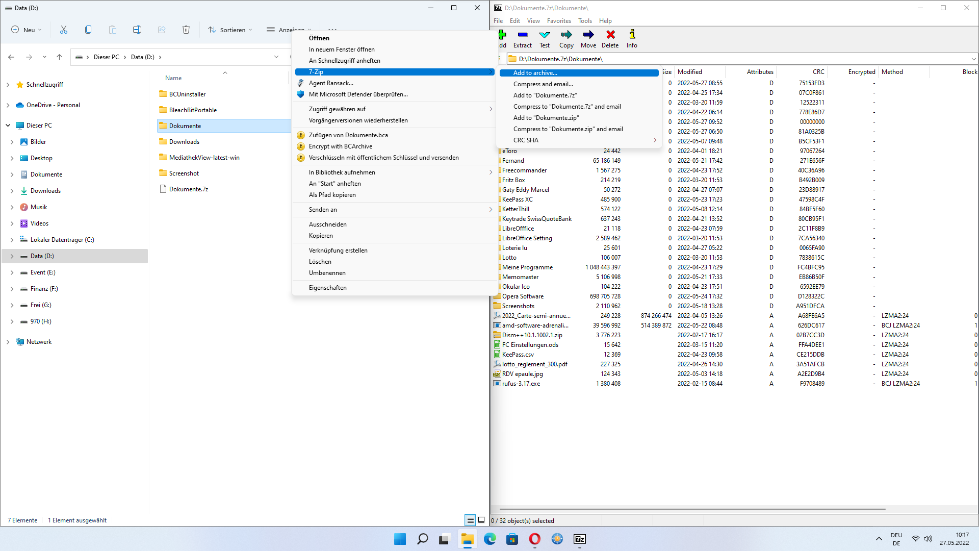Du öffnest deinen Explorer, wählst deinen Ordner, hier D:\Dokumente gehst zu 7zip > Add to Archive, da packst du alles.