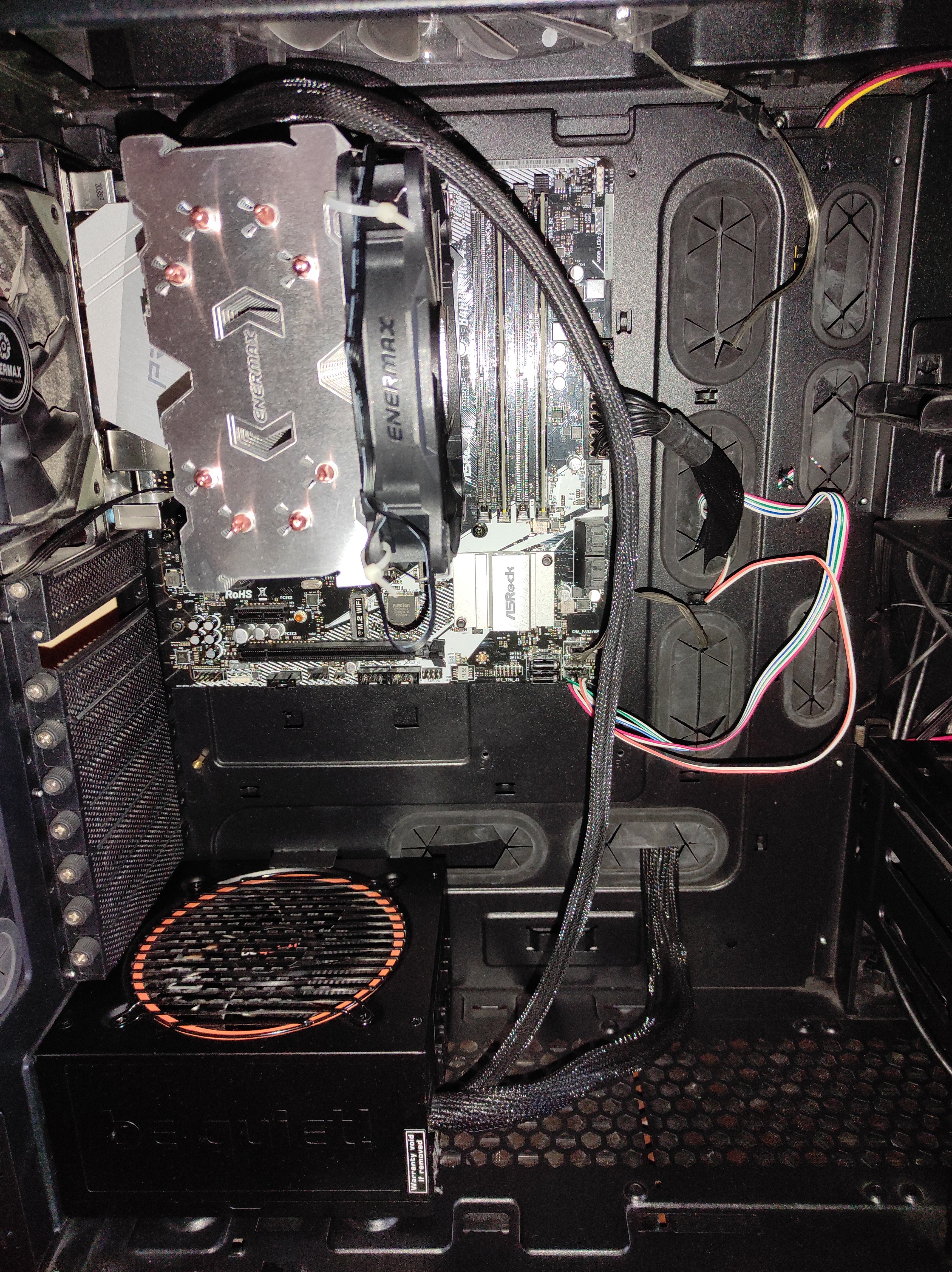 Das Netzteil ist aktuell falsch rum drin wie ich sehe, Kabel kommt also auf der Boardseite aus dem Netzteil und muss dann wie jetzt um den CPU Kühler oder eben vor der GPU zwischen Lüfter hinten und CPU Lüfter durch.