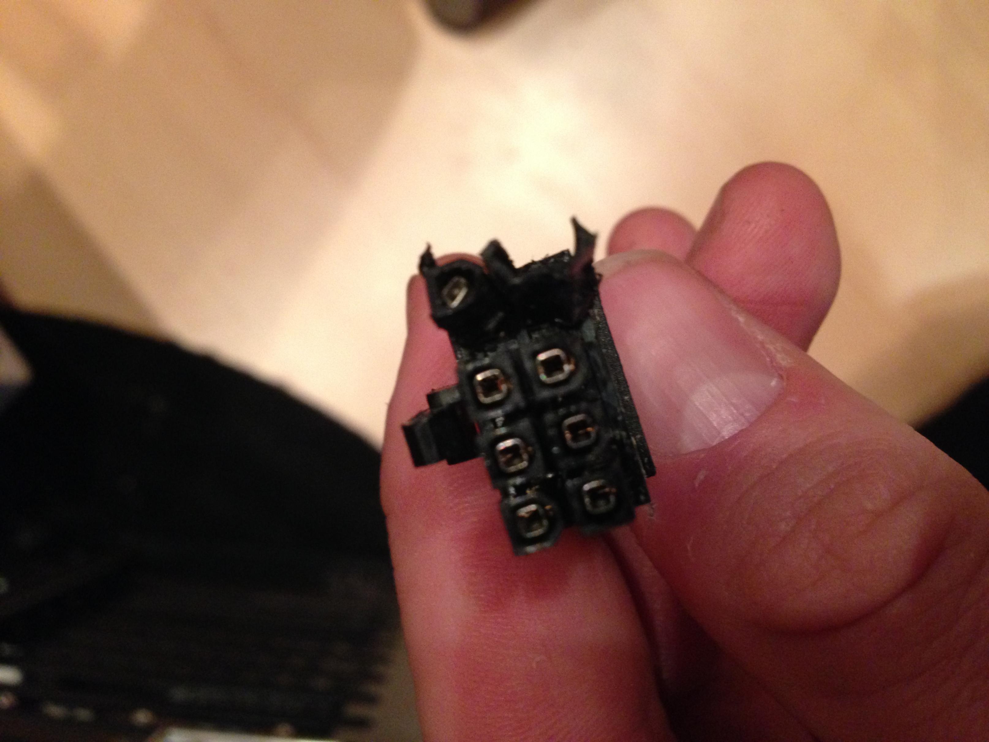 Leider musste ich gestern bei der Überprüfung des Netzteils feststellen, dass einer der 8 PIN Stecker ziemlich mitgenommen ist ( keine Ahnung, wie der Vorbesitzer das geschafft hat)- ein Pin fehlt (nur noch Plastikform vorhanden), der andere PIN ist komplett verbogen und die Plastikpassform ebenfalls deformiert.- siehe Fotos)