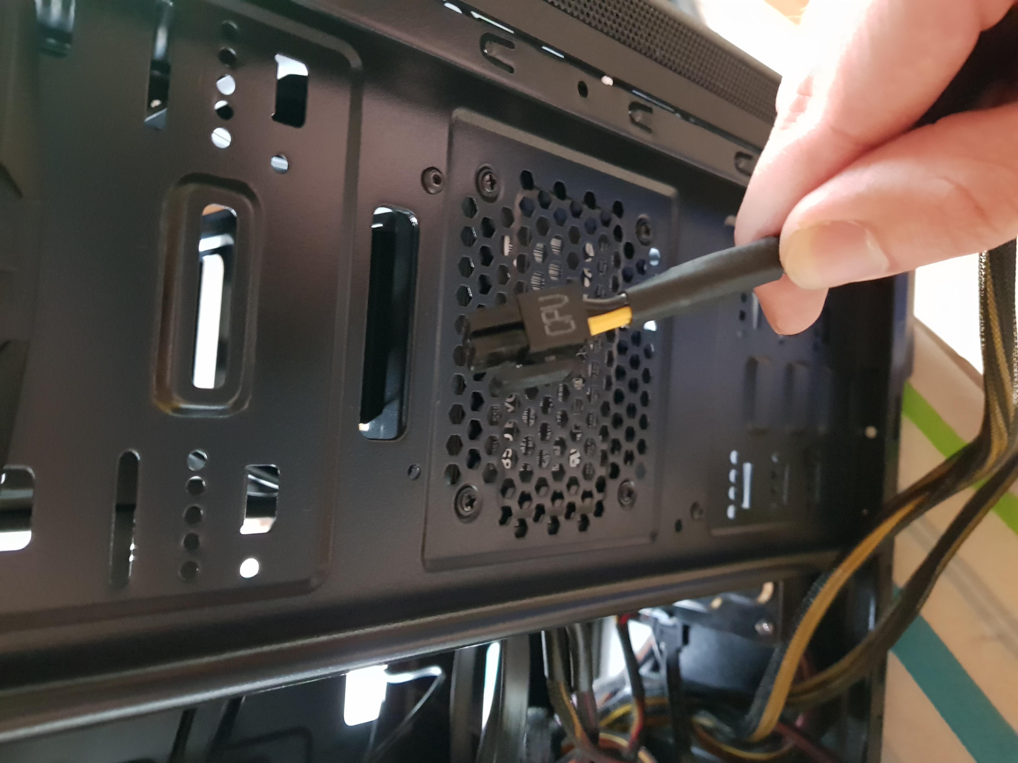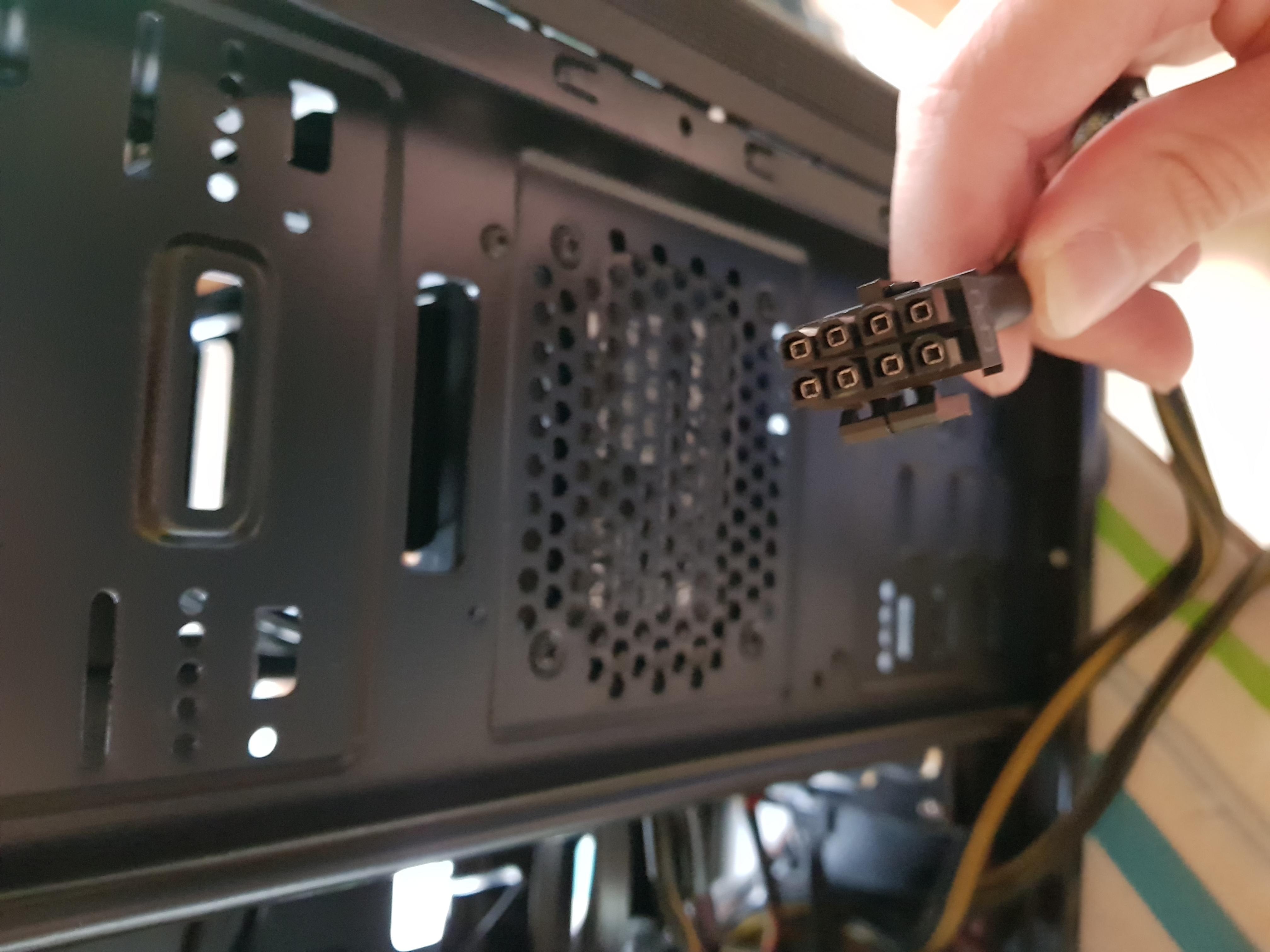Das Netzteil hat einen 8 poligen Stecker mit der Aufschrift "CPU", das Mainboard hat allerdings nur einen 4 poligen Anschluss, in der oberen linken Ecke, mit der Aufschrift "ATX 12V".