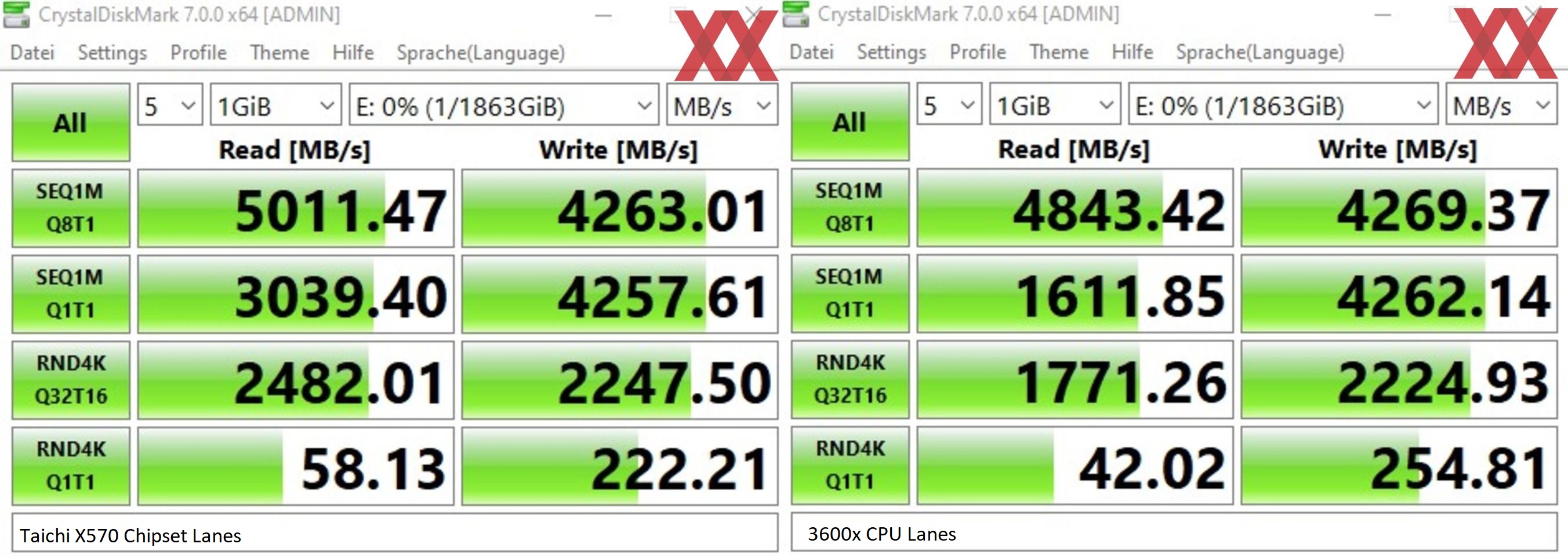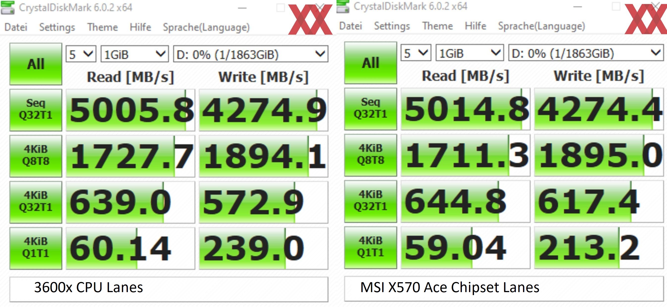 Welche Nachteile bezüglich Latenz und Bandbreite sind eigentlich zu erwarten, wenn die SSDs an den Chipsatz des X570 Mainboards statt der CPU angebunden werden?