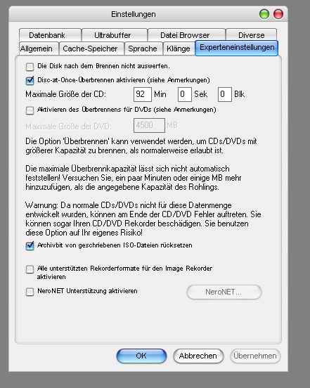 Die ansonsten Notwendigen Einstellungen unter Nero habe ich schon getan (Experteneinstellungen,usw...) aber selbst unter alcohol 120% wird der rohling nicht richtig erkannt....überlanges brennen soll aber mit diesem brenner unterstütz sein, habe lediglich gehört das aopen bei der Wahl der rohlinge etwas eigen sein sollte. Hat jemand eine Idee,meinen Brenner zu überlisten.