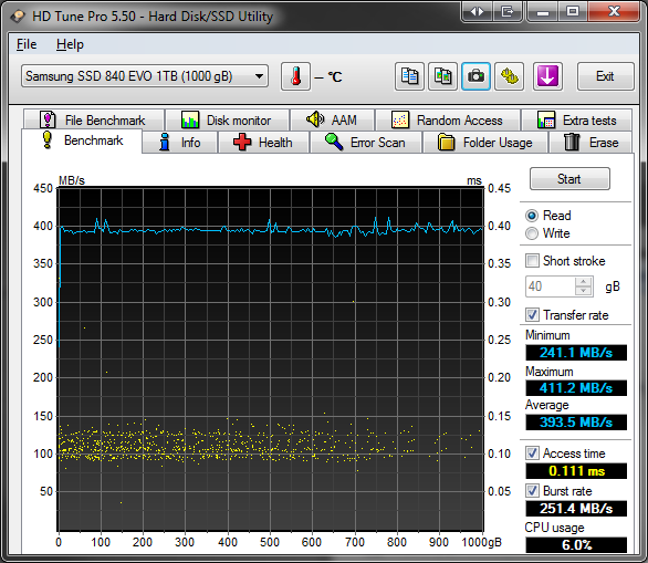 Diese langsamen Dateien sind nicht viele im Vergleich zu den mehreren Tausend die gelesen wurden. Unter 400 MB/s lesen jeweils ca. 50 Dateien pro SSD. Alle restlichen Dateien lesen mit 400 MB/s und mehr und selbst davon der Großteil mit ca. 500MB/s. Ich bin jedenfalls zufrieden mit dem Ergebnis von meinem Backup & Restore. Mit HD Tune habe ich ähnliche Erfahrungen gemacht, die Linie pendelt sich bei 400 MB/s ein und bleibt recht stabil, ist jedoch am Anfang bei ca. 250MB/s und es gibt auch Ausschläge in Richtung 440MB/s.