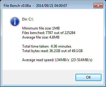Der Durchschnitt liegt deswegen bei > 500MB/s weil die Minimalgrösse der getesteten Dateien 1 MB ist. Diese voreingestellte Minimalgrösse wurde absichtlich in Filebench eingebaut, damit man auch wirklich die sequenzielle Lesegeschwindigkeit testet und nicht die '4K random'.
