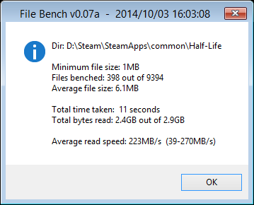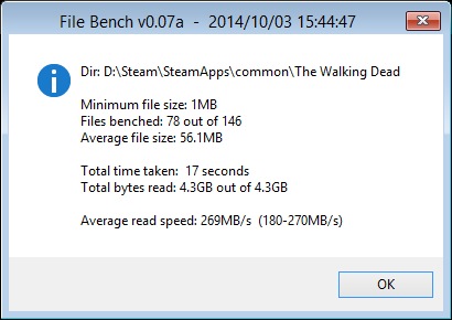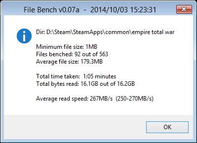 Anschließend am Ziel den Ordner wieder gelöscht. 3x 5GB Modelpacks aus Empire: Total War auf die Festplatte kopiert. Diese 3 liegen gelassen, und noch mal den 15GB Ordner vom Anfang mit ca. 300 Dateien angestoßen ... anfangs über 200 MB/s mit Hilfe des Cache, danach bis zum Ende über 115 MB.