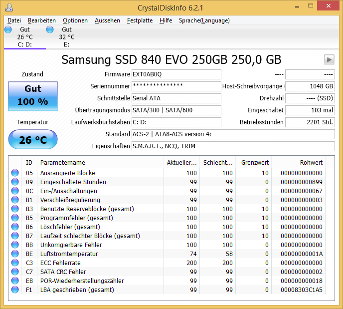 Die S.M.A.R.T. Werte sehen eigentlich in Ordnung aus. RAPID könnte ich mal ausschalten. Das Problem trat erst vor einigen Wochen auf. Ich weiß nicht mehr ab wann genau. Hatte davon eine 840 Basic drin, die ich dann auf die 840 Evo geklont habe... Weiß nur nicht mehr, ob es gleich danach oder erst später erstmals auftrat.
