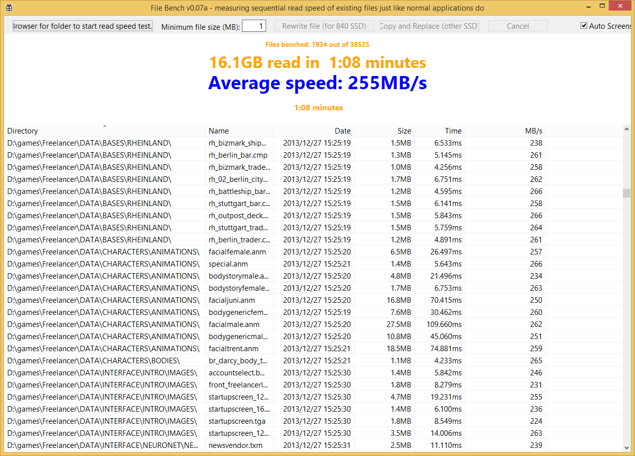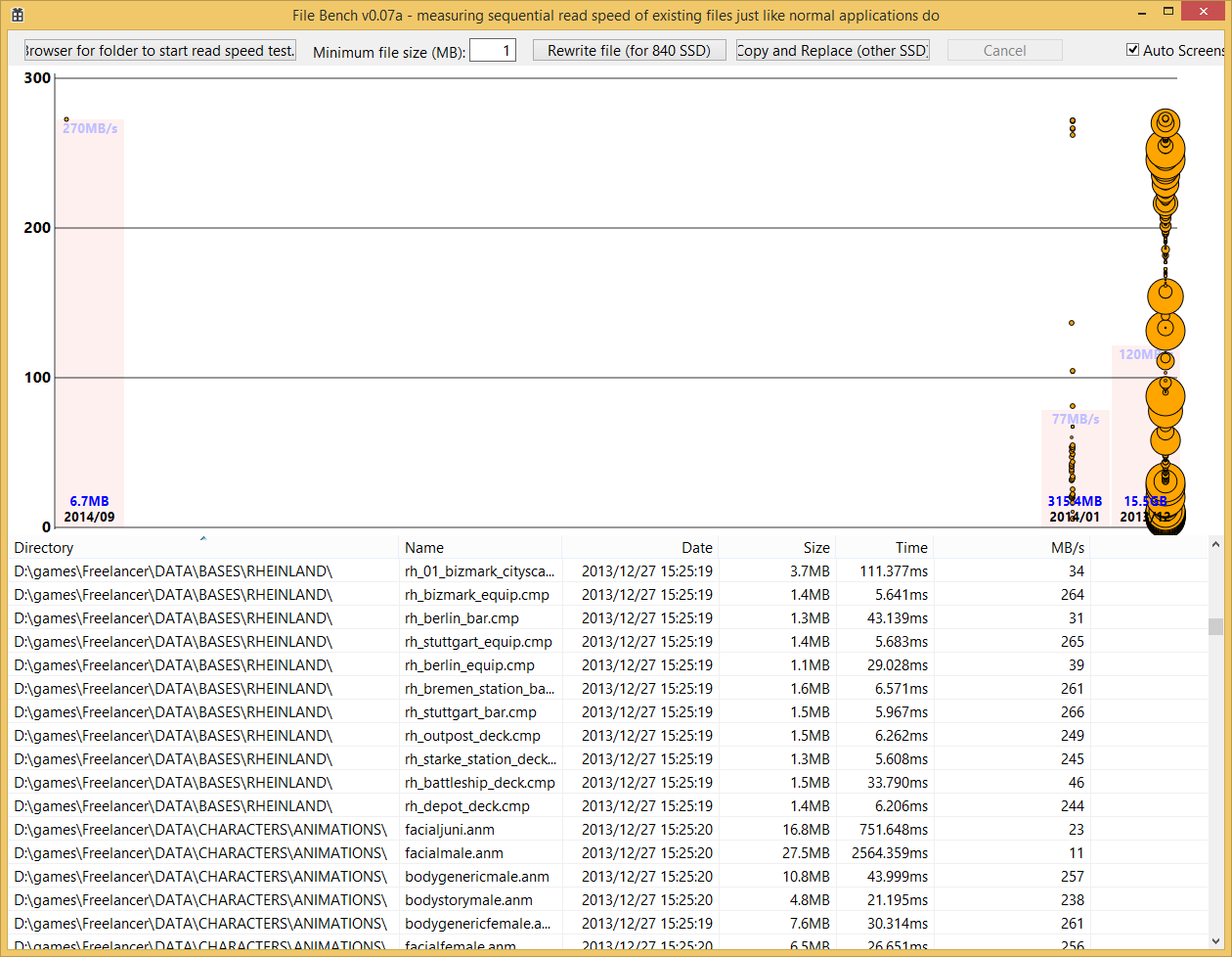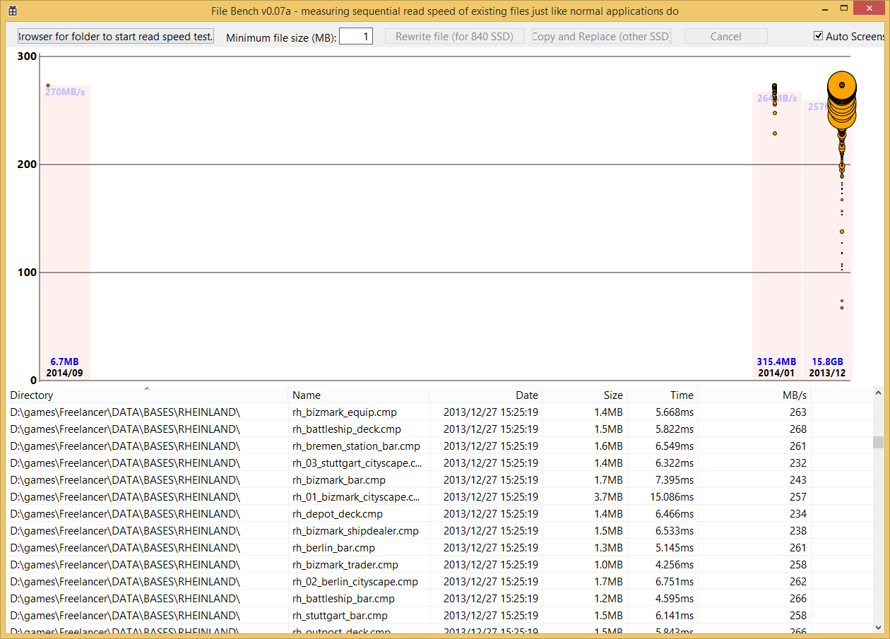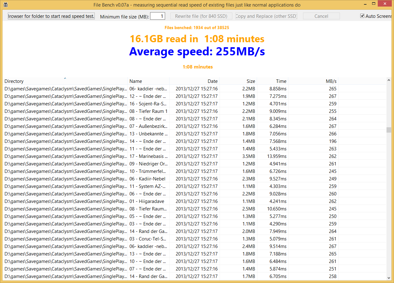 Zum Teil sind Dateien im gleichen Ordner mal mit 5 und mal mit über 250MB/s gelesen, obwohl sie zur selben Zeit auf die SSD geschrieben wurden.