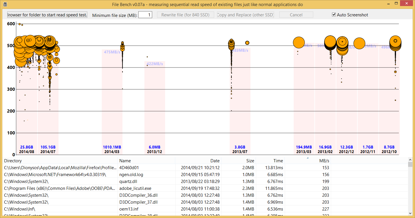 Ich habe meine 840 Evo 1 TB Ende August in Betrieb genommen und nach nur sechs Wochen Betriebszeit spuckt Filebench auf meiner Systempartition nur noch eine durchschnittliche Lesegeschwindigkeit von 80 MB/sec aus - was deutlich langsamer ist als meine herkömmliche Datengrab-Festplatte. Nun habe ich mal mit Mydefrag "defragmentiert", d.h. alle Daten wurden neu geschrieben und schon sind es wieder 526 MB/sec. Leider ist diese Lösung nicht nachhaltig. Das ist schon ein krasser Unterschied und auch im praktischen Betrieb deutlich spürbar, etwa beim Booten oder beim Starten von Anwendungen. Selbst weniger erfahrene User würden das merken - und warum Samsung nicht ?