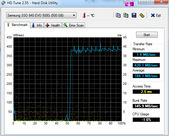 Da ich von dem Problem bei den 840er EVOs schon in den letzten Wochen was gelesen habe, und mir mein Rechner die letzten tage extrem lahm vorkommt, habe ich mal einen Benchmark laufen lassen und war geschockt als ich den Verlaufswert sehen musste.