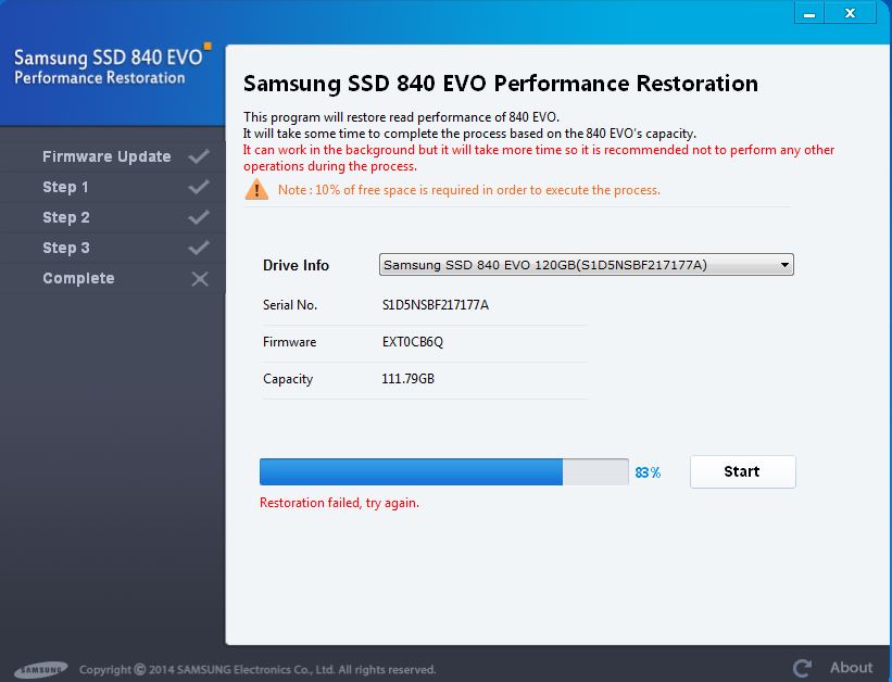 SSD830: Operation kann nicht zuende geführt werden. Nach einigen Neustarts (PC blieb mehrmals "hängen") geglückter Start und 10% sind nun nicht mehr zugeordnet.