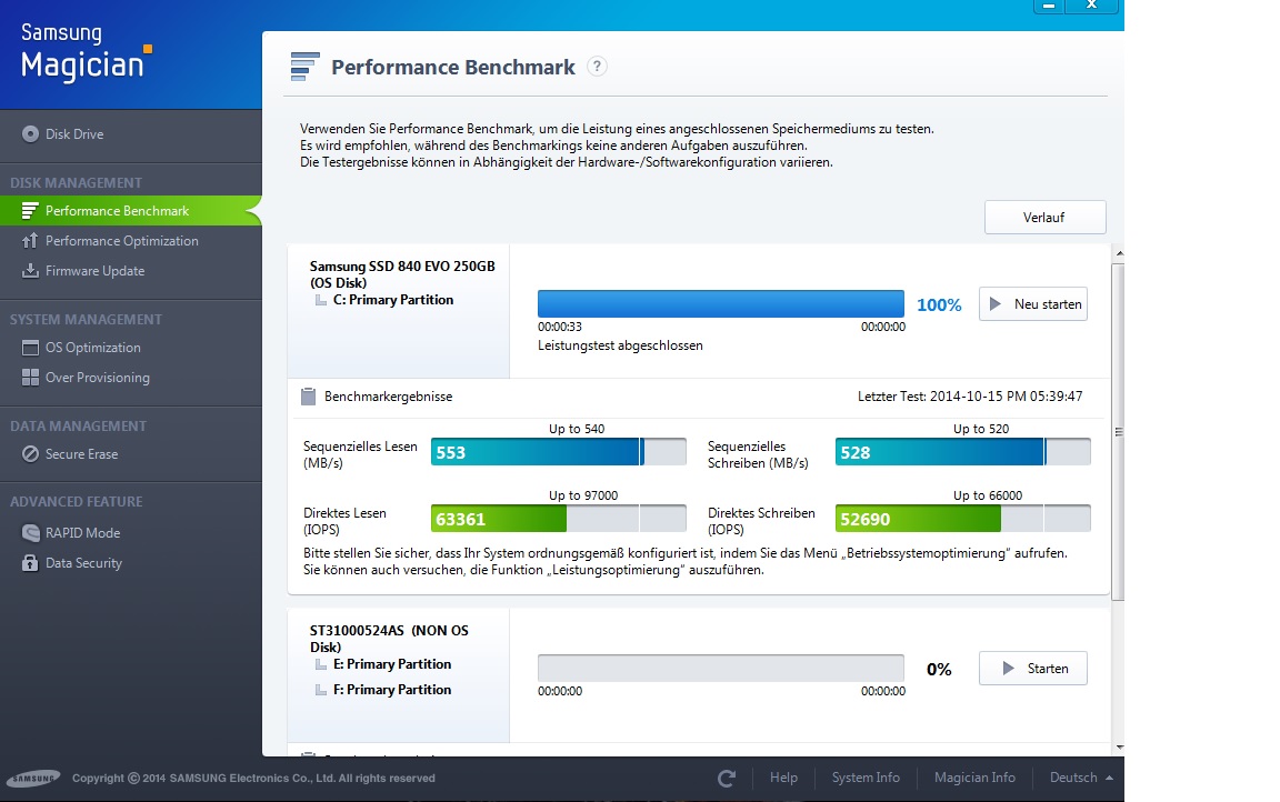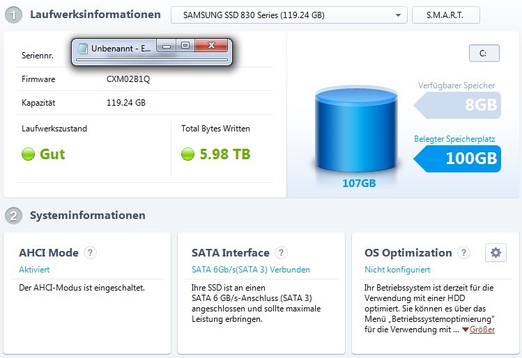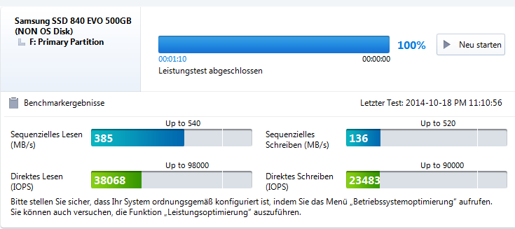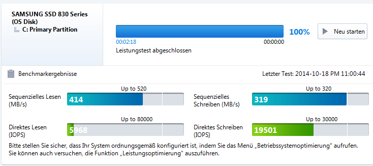 Zur SSD840EVO und der schon länger im System befindlichen SSD830 128GB sehe ich aktuell folgende Leistungsdaten (Virenscanner deaktiviert):