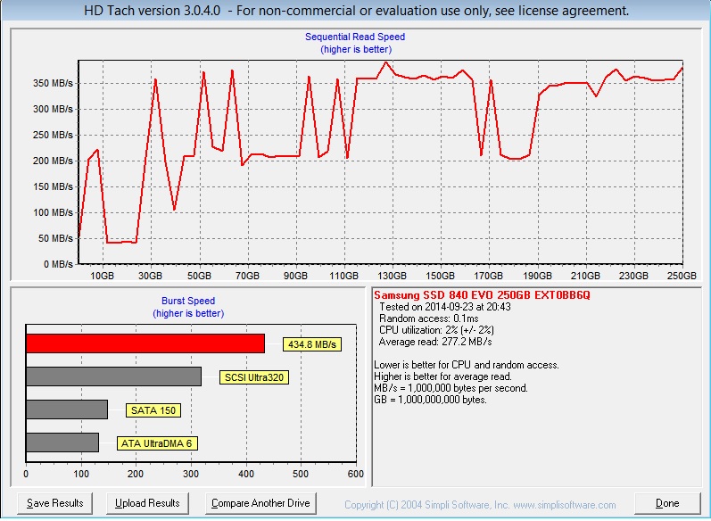 HDTach läuft spielt nicht so gut mit der EVO zusammen. Besser ist HDTune auch ein Sektortestprogramm oder FileBench (hab ich extra geschrieben um den Fehler zu analysieren und wurde auch schon oft verwendet), das dateiorientiert arbeitet.