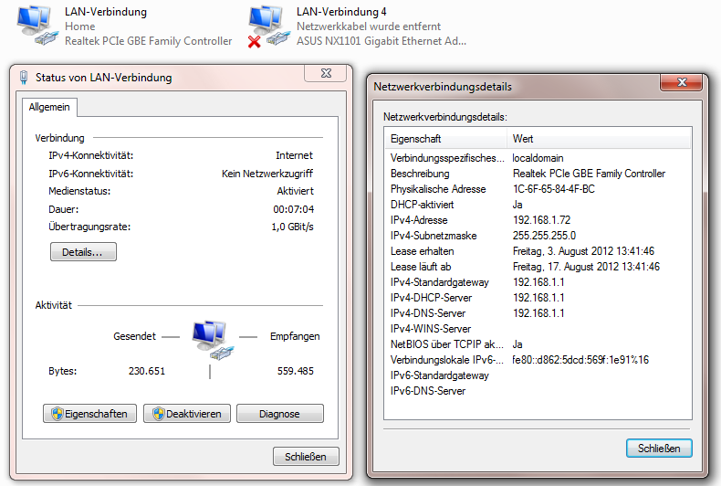Probleme machen meine Netzwerkanschlüsse unter Windows 7 SP1 x64, SP auf neustem Stand. Über die onboard Netzwerkkarte wird mir immer angezeigt das ein Kabel nicht angeschlossen ist, alles mit Notebook getestet, Kabel ist o.K. Onboard im Bios deaktiviert und eine neue Asus NX 1101 Karte im PCI Steckplatz eingebaut, Treiber installierte sich von CD automatisch. Im Gerätemanager ohne Fehler, gleiches Problem mit dem Netzwerkkabel >> Kabel nicht angeschlossen. Alle Treiber aktualisiert, Netzwerkeinstellungen neu gemacht, es geht nichts. Über Wlan klappt alles, allerdings werde ich immer rausgeworfen/getrennt (nur mit diesem Rechner, 5 andere Rechner haben keine Probleme, Notebook geht auch, verschiedene Handys haben auch kein Problem). Nun war ich gestern schon so weit ein anderes Board zu besorgen, weil ich gedacht habe (Aussage vom Techniker bei Gigabyte, das kann schon mal so sein, das dann auch die anderen Karten nicht mehr laufen, die man in PCI einsteckt).