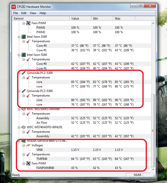 Nun habe ich mal im Internet geforscht und bin darauf aufmerksam gemacht worden, mal die Temperaturen zu checken. Gesagt Getan. Nun kann ich mir aber nicht vorstellen das die Temperaturen meines Rams und der Grafikkarte normal sind wenn auf dem Deksotp bin.