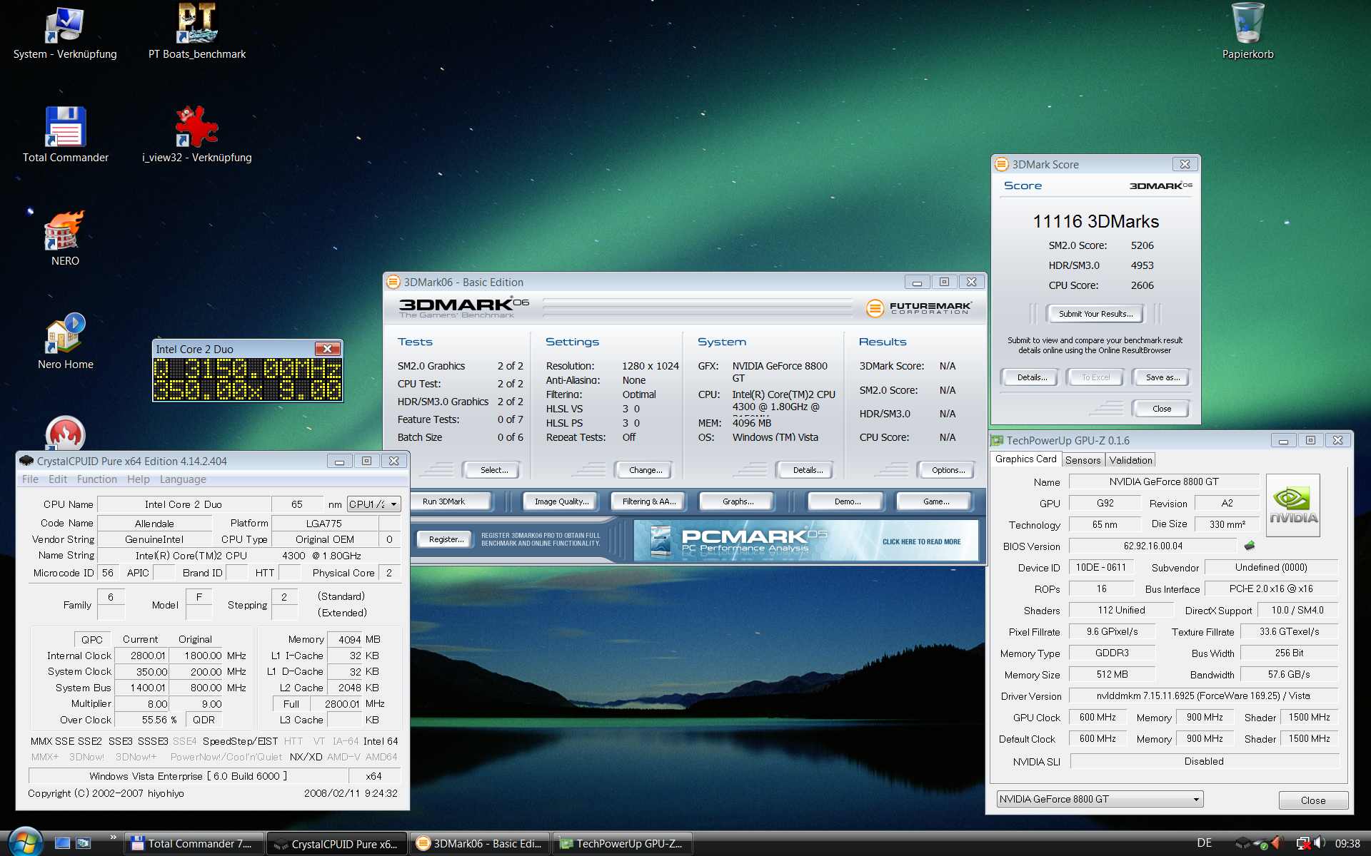 so, hab eine der ersten 8800gt geholt, ne bfg oc variante mit 625/900/1566. hab die werte core auf 696mhz, den speicher auf 954mhz und den shader auf 1744mhz... obwohl man mit atitool nur der den core und den mem einstellen kann war die shader mit übertaktet!!! wie ist das möglich? also auch mal auf find max core geklickt, da wurde 885mhz angegeben und bei mem 1108mhz... da is noch potential. wenn ich die werte aber eingestellt hab, is der pc abgekackt.... na ja, liegt wsl an shader takt... wie kann ich den runterregeln und zugleich den core takt und mem takt anheben? naja, alles wurde unter standard Spannung erreicht. http://flickr.com/photos/18839079@N02/2258051590/ mfg
