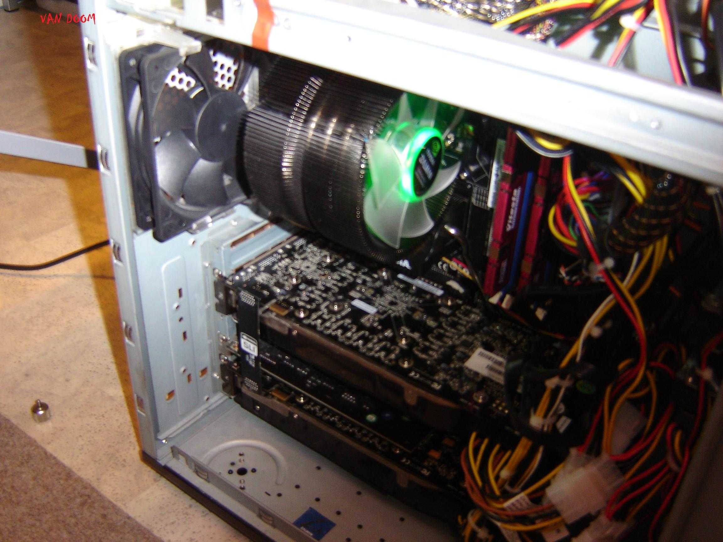 Hab noch 3 Festplatten drinnen, 3x 120mm Lüfter, 2x 92mm Lüfter, EVGA 680i SLI, Nen Core 2 Duo E 6600 @ 3,6Ghz, EVGA 680i SLI, 2GB Adata Vitesta Extreme, Creative Audigy 2ZS, Zalman CPU-Kühler und 2x 8800 GTX. Und das nur an einem 600 Watt Netzteil