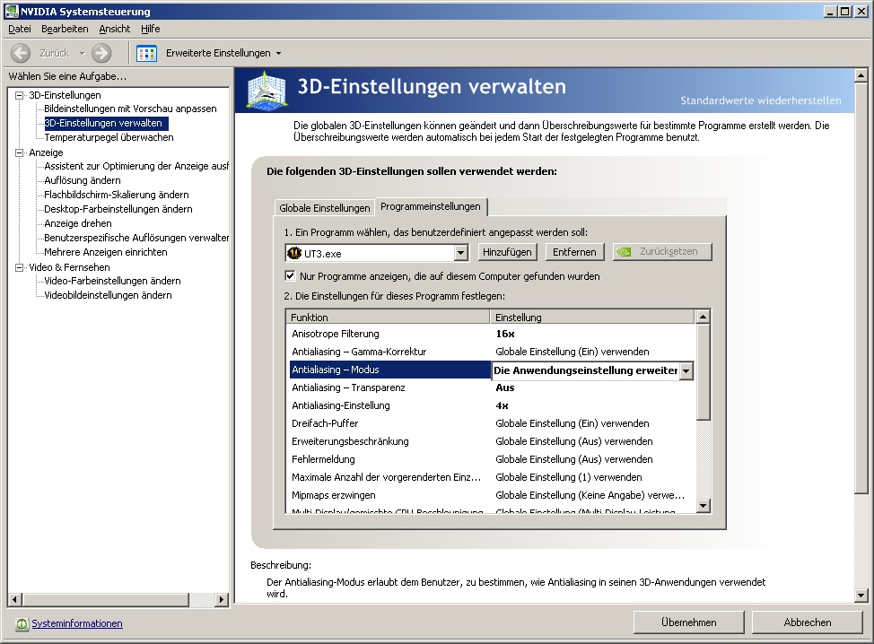 Alles ohne Erfolg. In nahezu keinem Spiel erhalte ich zuverlässig AntiAliasing. Ob nun über die Anwendung oder erzwungen über den Treiber spielt keine Rolle. Manchmal geht es, aber meistens nicht und wenn, dann nur vorübergehend.
