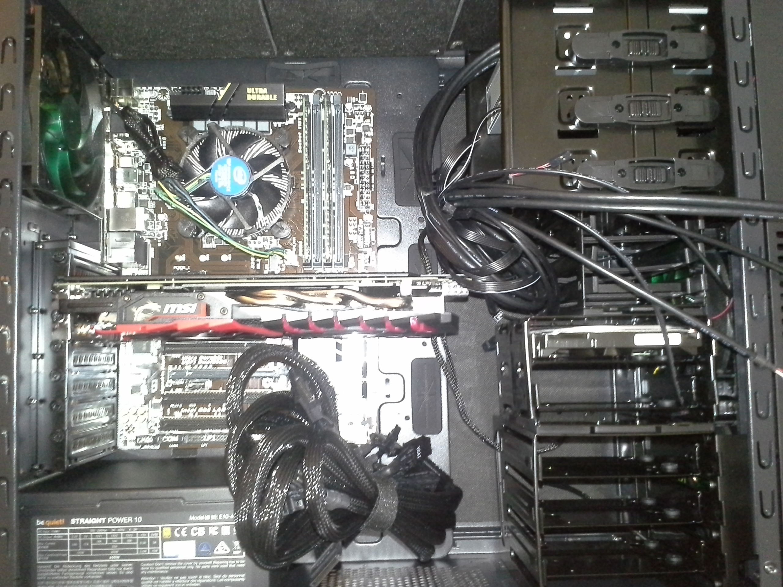 Die HDD kannst du auch wieder rausnehmen, inkl. dem oberen HDD Käfig wo sie drin steckt. So wird dann nicht der gesamte Luftstrom der von Vorne kommt blockiert.