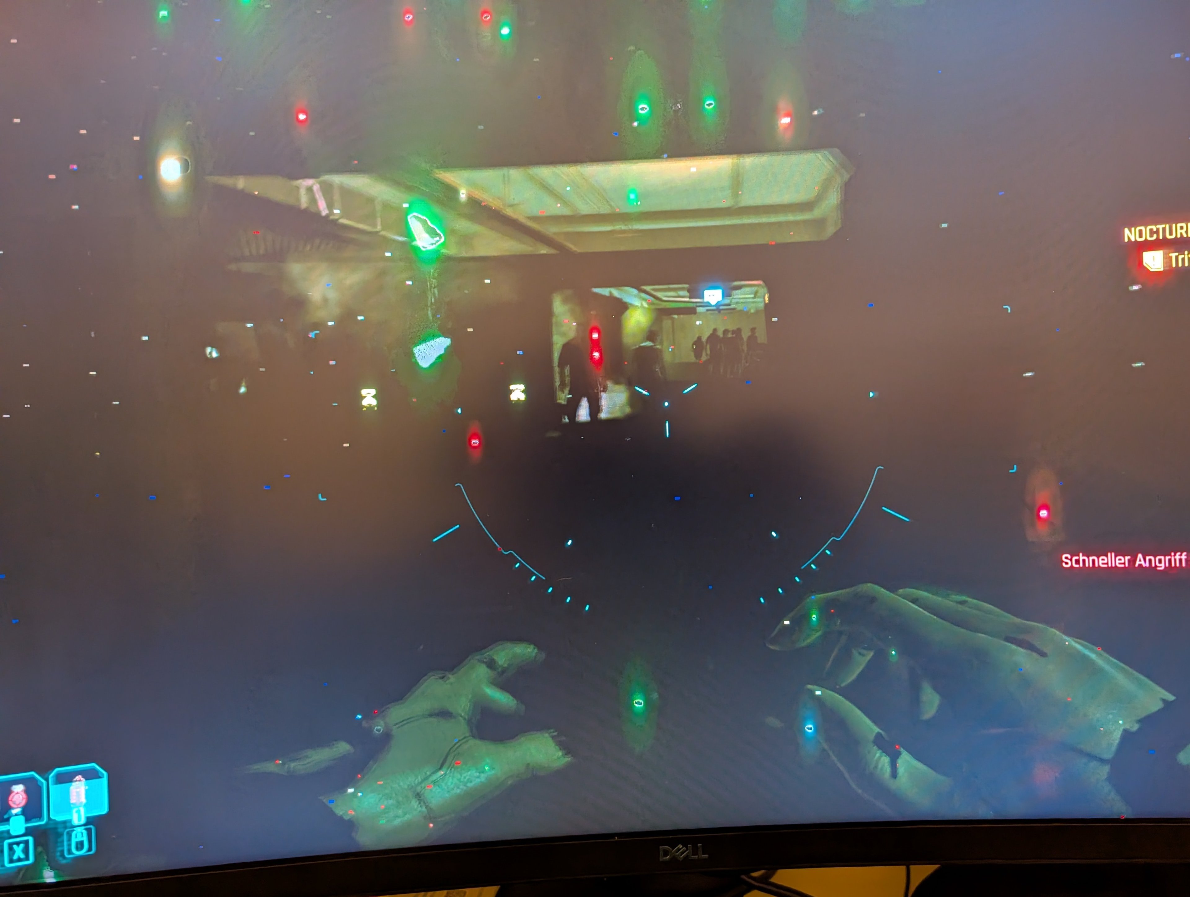 Dann der erste Schock, vereinzelnt rote, gelbe, grüne, blaue (Punkt-)Lichter wie an einem Christbaum blinkend.