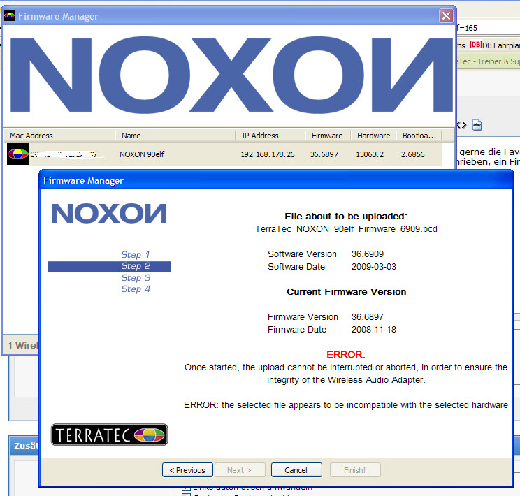 Ich habe genau dieses Problem bei einem früheren Firmware-Update gehabt. Mir hat damals die Verwendung des alten "NOXON audio Managers v3.0.18" (Vorläufer des Firmware Managers) zu einem erfolgreichen Update verholfen. Den sollte es auf dem FTP-Server von Terratec im NOXONiRadio/Update/History-Ordner noch geben.