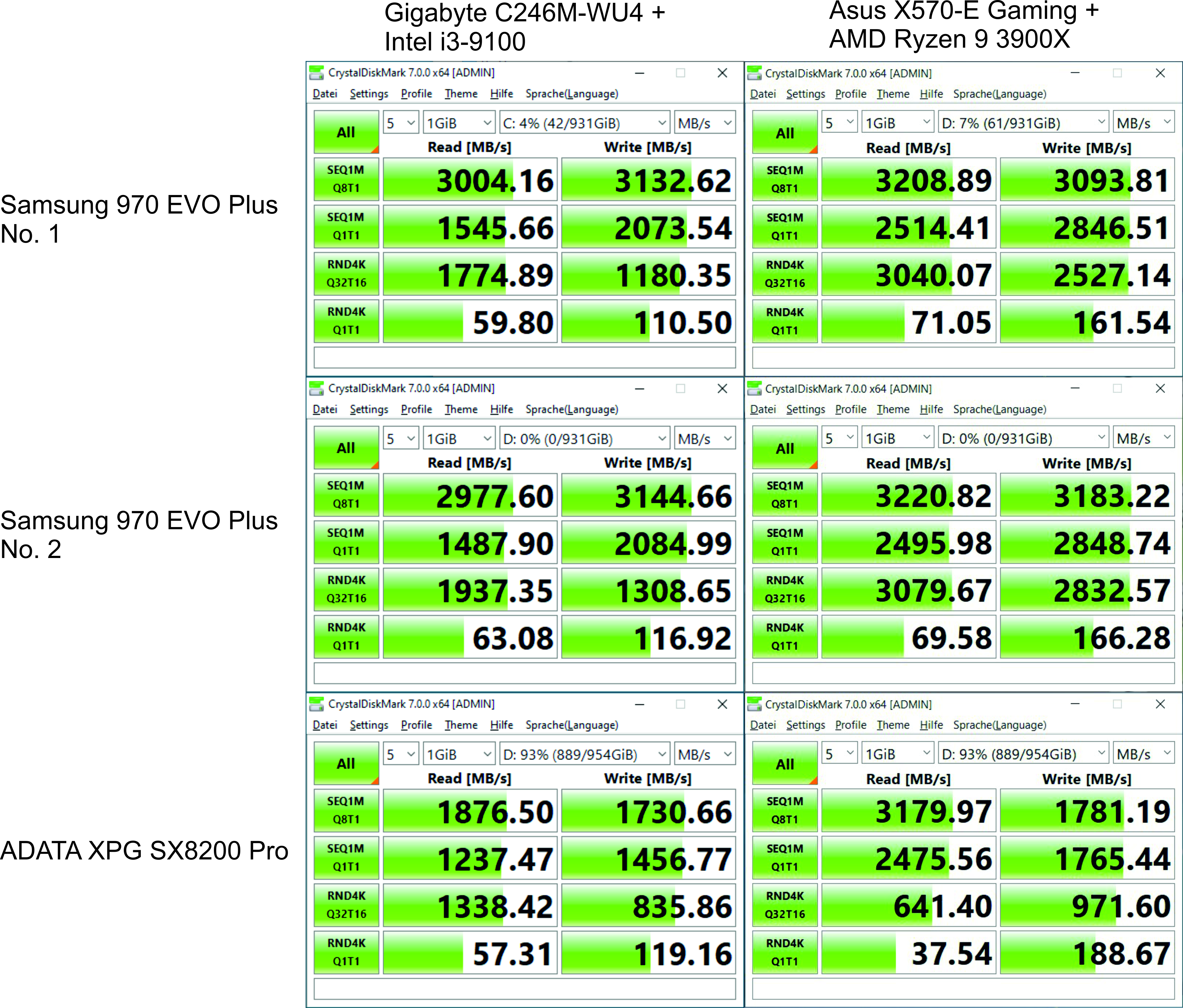 Zuerst hatte ich die EVOs im Intel-System (neue Win 10 Pro Version 21H2 Installation) und hab mich tierisch gewundert warum meine Werte so extrem von den Werten im Artikel abweichen, folglich habe ich sie dann auch in mein AMD-System (Win 10 Pro Version 2004) verbaut und nochmal gebencht. Die ADATA diente lediglich zur Kontrolle.